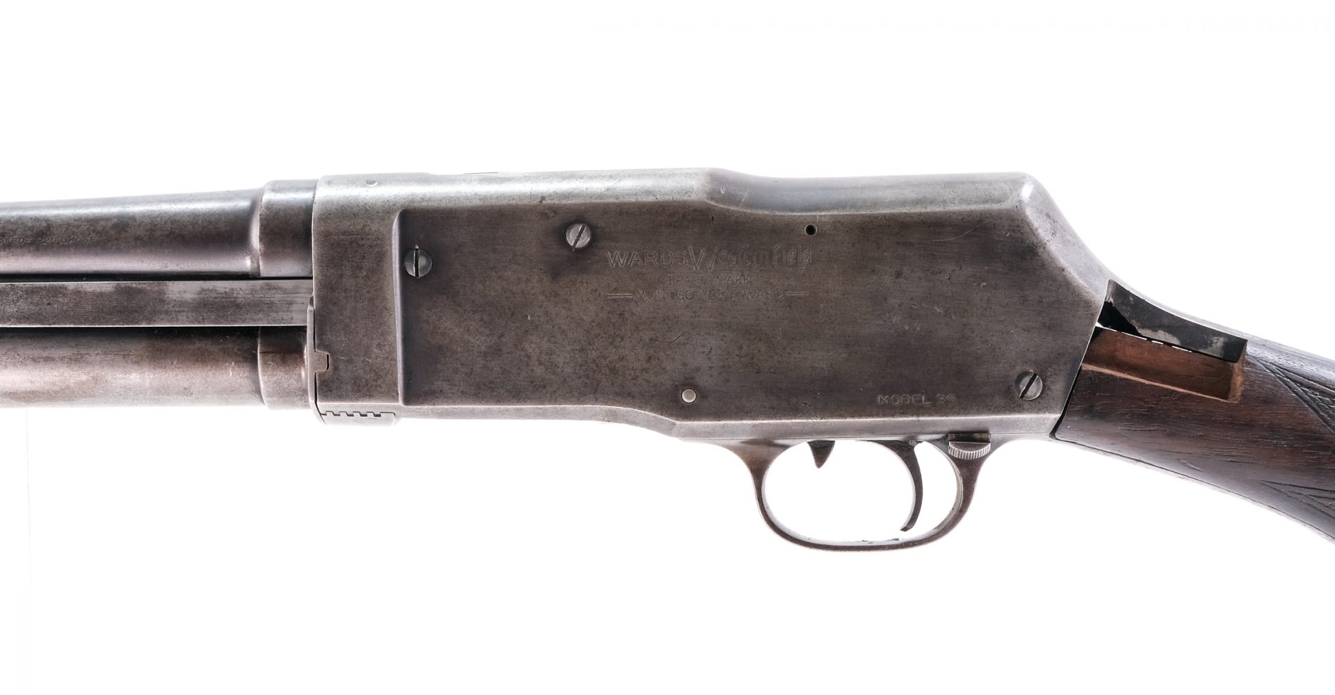 Description Montgomery Ward Western field model 35 in 20 ga with a four shell capacity and a 28″ FULL choke barrel. Plastic butt plate, solid checkered wood stock and foregrip. Steel bead front fixed sight. Proof tested barrel. This pump action shotgun must ship to a C&R or FFL holder.