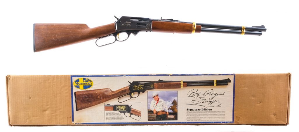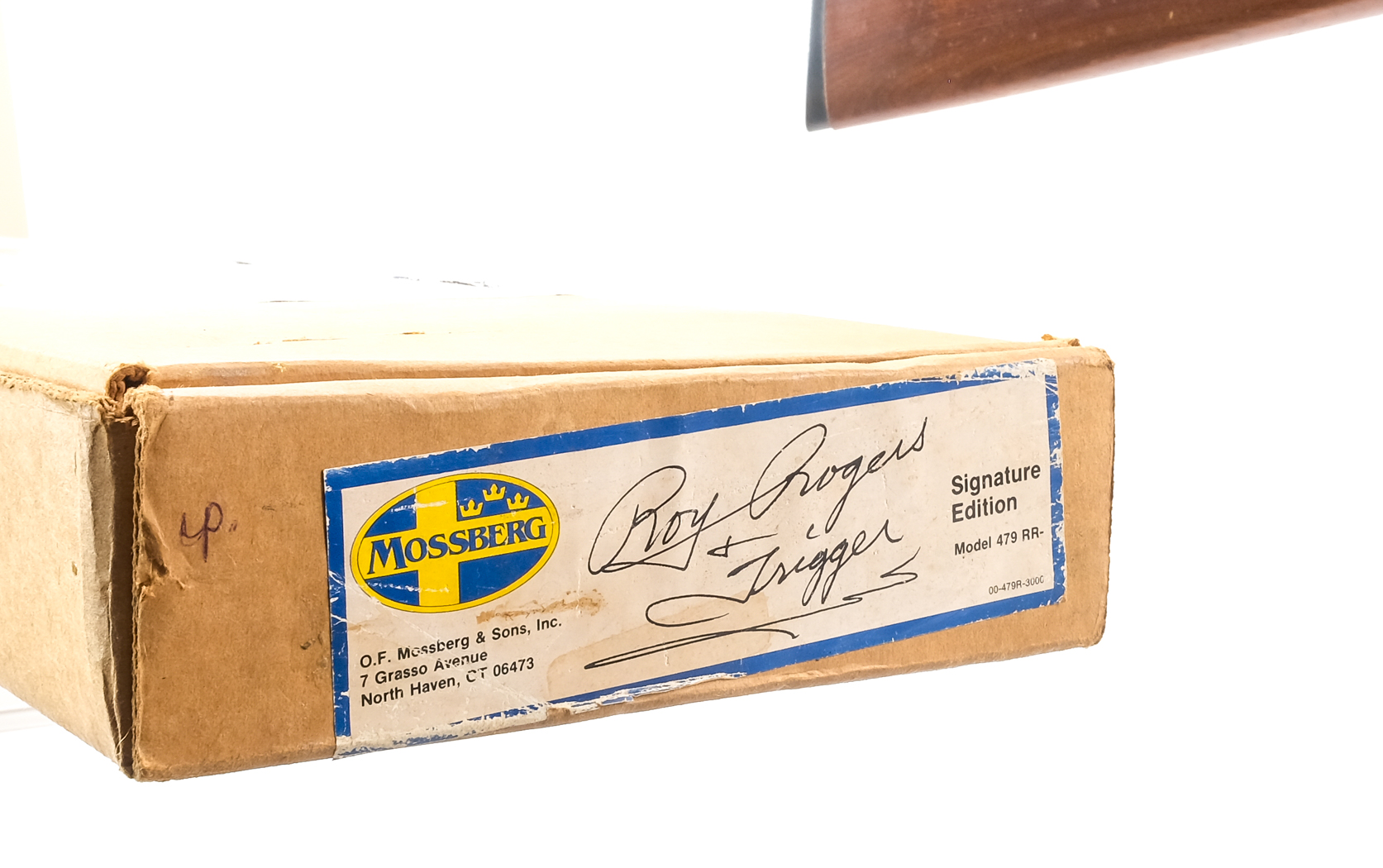 Description Mossberg 479RR Roy Rogers & Trigger Signature Edition in .30-30 Winchester with a Five round capacity and a 18.25″ barrel. One of five thousand made. Checkered black composite butt plate. Smooth wood stock and front foregrip. Blued hand lever, serrated trigger, receiver, magazine tube and barrel. Gold finished trigger and barrel bands. Right side of receiver loading gate. Rear adjustable and front fixed blade sight. Comes in its factory box with matching serial number, branding information and a Guns & Ammo magazine with this Signature Models introduction. Must ship to a FFL holder. Condition: Very Good with very light touches of rust on the top of barrel by receiver. Clean rifled bore. Barrel Length: 18.25″ Serial: RR-0832 Manufacturer: Mossberg Caliber: .30-30 Win Model: 479RR Book# 9-518
