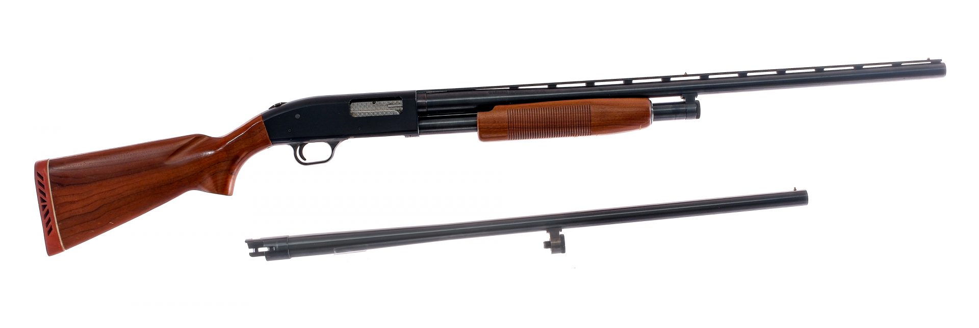 Description Mossberg Model 500A in 12 gauge 2 3/4″-3″ with a four round capacity and a 28″ top rib vented MOD removable choke barrel. Rubber butt pad. Smooth wood stock and serrated front forend. Black composite trigger guard. Blued trigger, receiver, magazine tube and barrel. Rear receiver slide button safety. Rear trigger guard action release. Rear brass and front white bead fixed sight. Comes extra 28″ MOD fixed choke barrel. Must ship to a C&R or FFL holder. Condition: Good with scratches, wood dings and touches of rust. Clean smooth bores. Barrel Length: 28″ Serial: 52864 Manufacturer: Mossberg Gauge: 12 Model: 500A Book# 03920