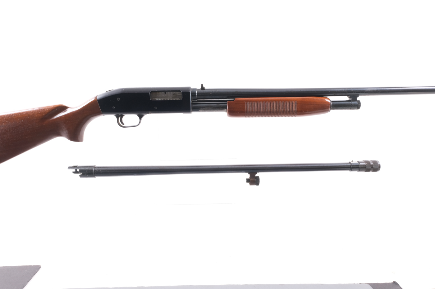 Description Mossberg-Type (Unbranded Receiver) 500C in 20 gauge 2 3/4″-3″ with a five round capacity and a 24″ CYL fixed choke barrel. Serrated hard rubber butt pad. Smooth wood stock and serrated front forend. Black composite trigger guard. Blued serrated trigger, receiver, magazine tube and barrel. Rear left receiver located action release. Rear receiver tang serrated slide button safety. Adjustable flip up and front fixed blade sight. Comes with a extra 26″ Mossberg 20 gauge barrel with a C-Lect Choke muzzle located adjustable choke. Must ship to a FFL holder. Condition: Good with light scratches, wood dings and touches of rust. Clean smooth bores. Barrel Length: 24″ Serial: NVSN Gauge: 20 Ga. Model: 500C Book# 9-084