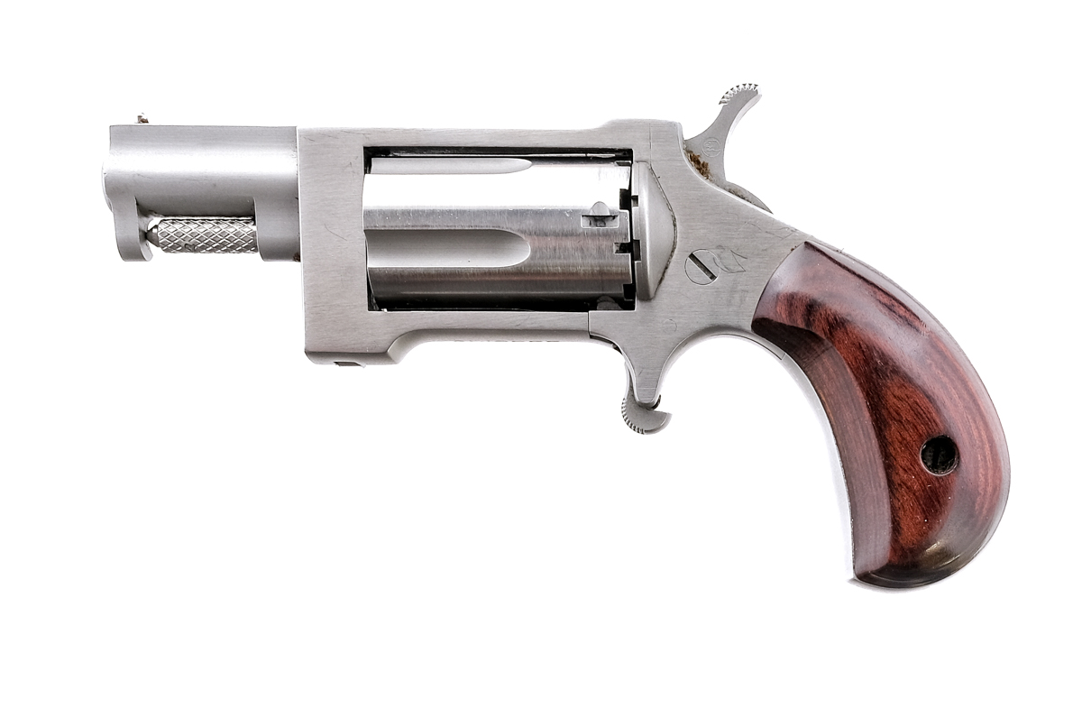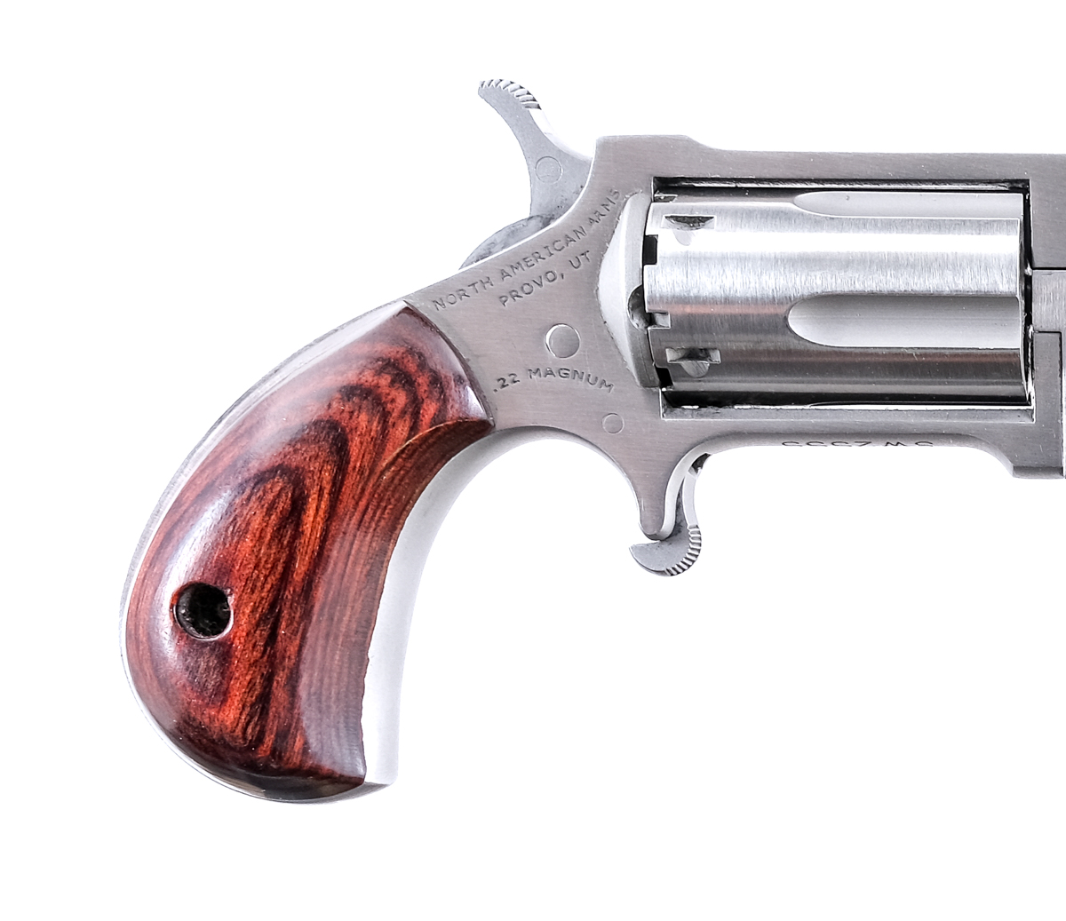 Description NAA (North American Arms) derringer in .22 Magnum with a five round capacity and a 1.5″ barrel. Smooth laminated wood grips. Polished stainless steel frame, cylinder and barrel. Serrated trigger and serrated hammer. Under barrel checkered cylinder release. Front fixed metal bead sight. Must ship to a FFL holder. Condition: Very Good/Excellent with light handling wear. Clean rifled bore. Barrel Length: 1.5″ Serial: SW2555 Manufacturer: North American Arms Caliber: .22 Mag Model: NAA Mini Revolver Book# 88
