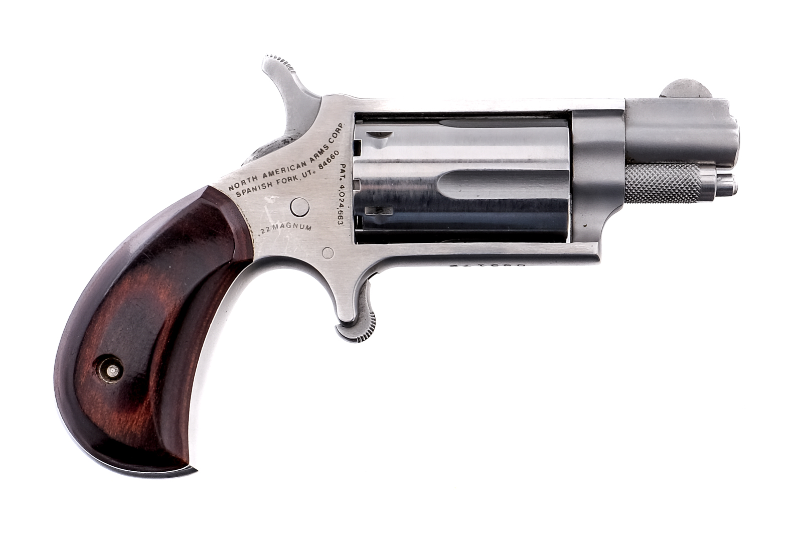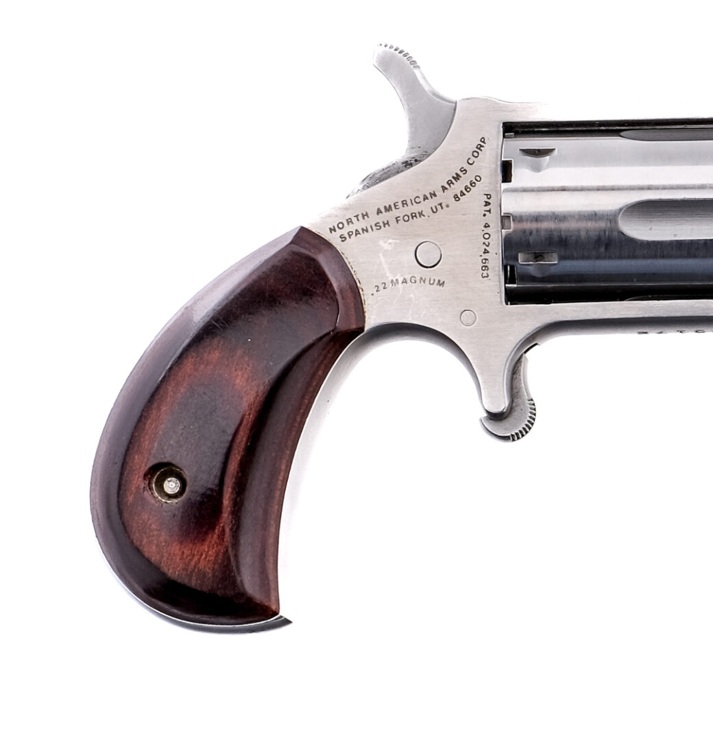 Description North American Arms Derringer in .22 Magnum with a five round capacity and a 1.25″ barrel. Smooth wood grip plates. Polished stainless steel frame, cylinder and barrel. Serrated trigger and hammer. Front fixed blade sight. Under barrel cylinder release pin. Comes in its factory branded leather belt holster. Must ship to a FFL holder. Condition: Very Good/Excellent with light handling wear. Clean rifled bore. Barrel Length: 1.25″ Serial: D85172 Manufacturer: North American Arms Caliber: .22 Mag Model: NAA Mini Revolver Book# X-306