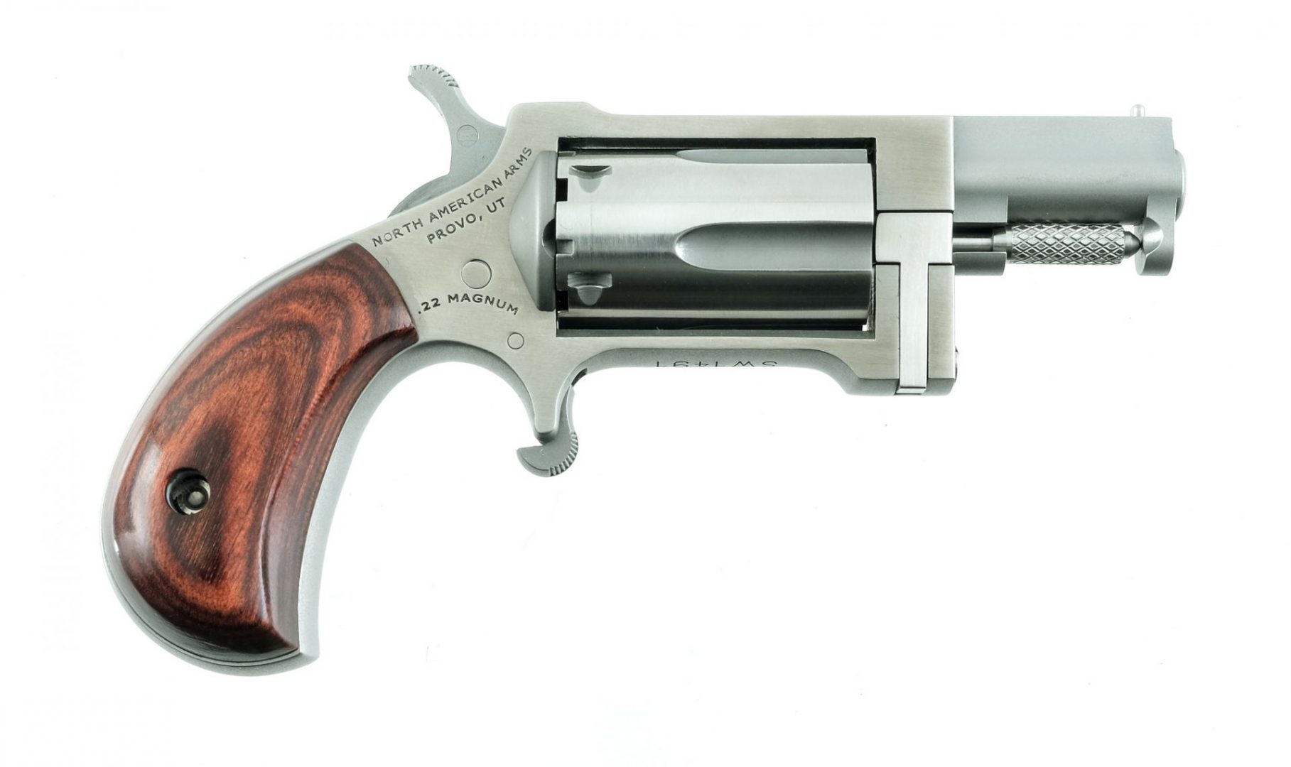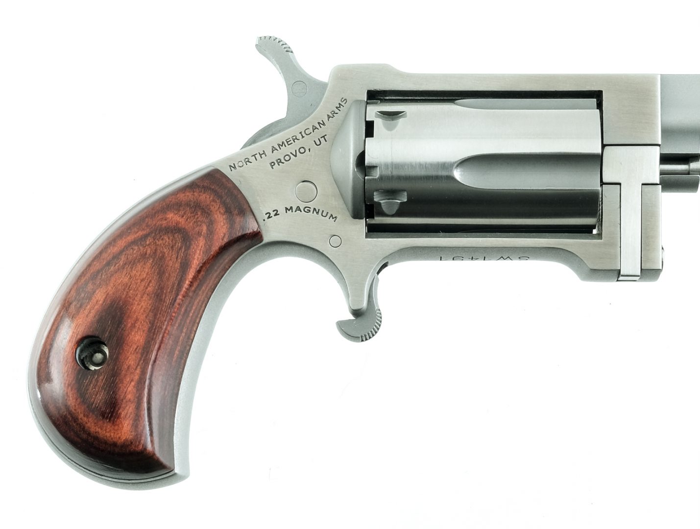 Description North American Arms Sidewinder in .22 Magnum with a five round cylinder capacity and a 1.5″ barrel. Laminated smooth wood grip plates. Polished stainless steel frame, cylinder and matte barrel. Serrated trigger and hammer. Under barrel checkered cylinder release pin. Front fixed post sight. Comes in its factory hard case with matching serial number and instruction manual. Must ship to a FFL holder.