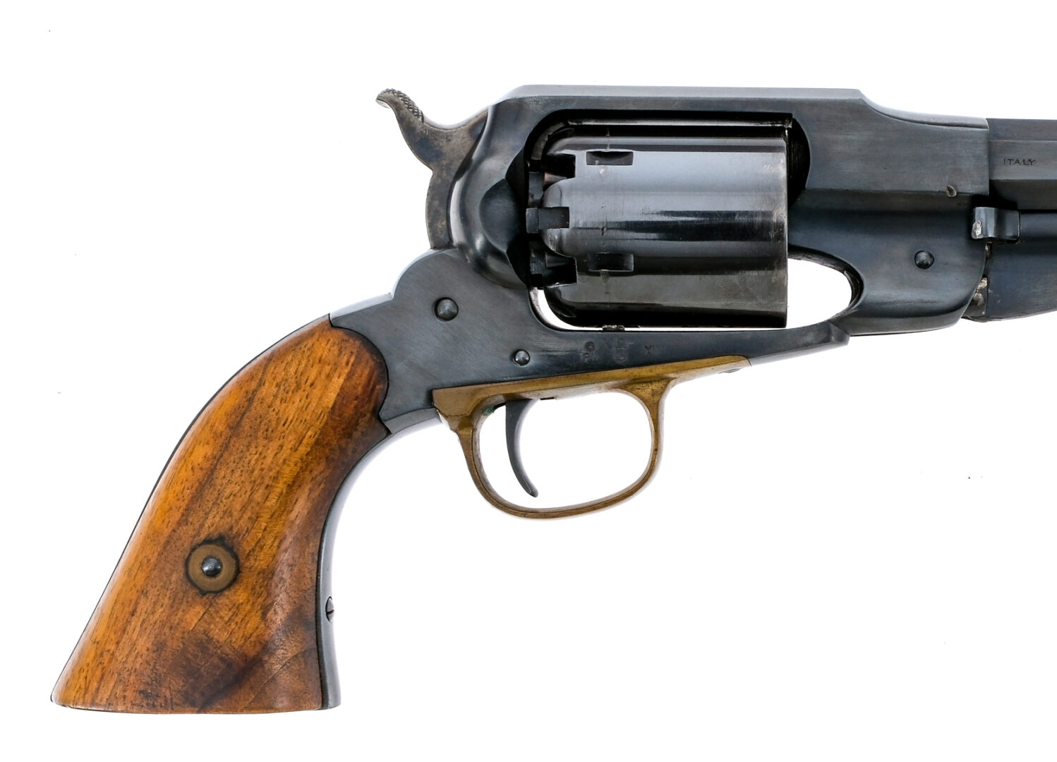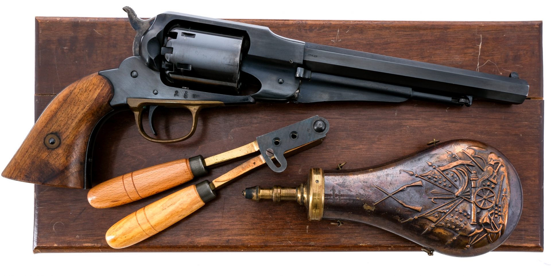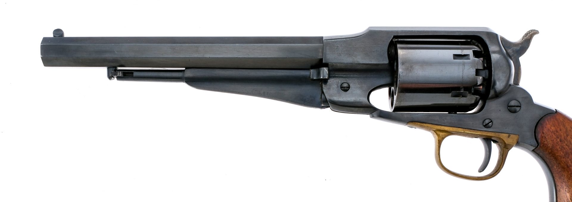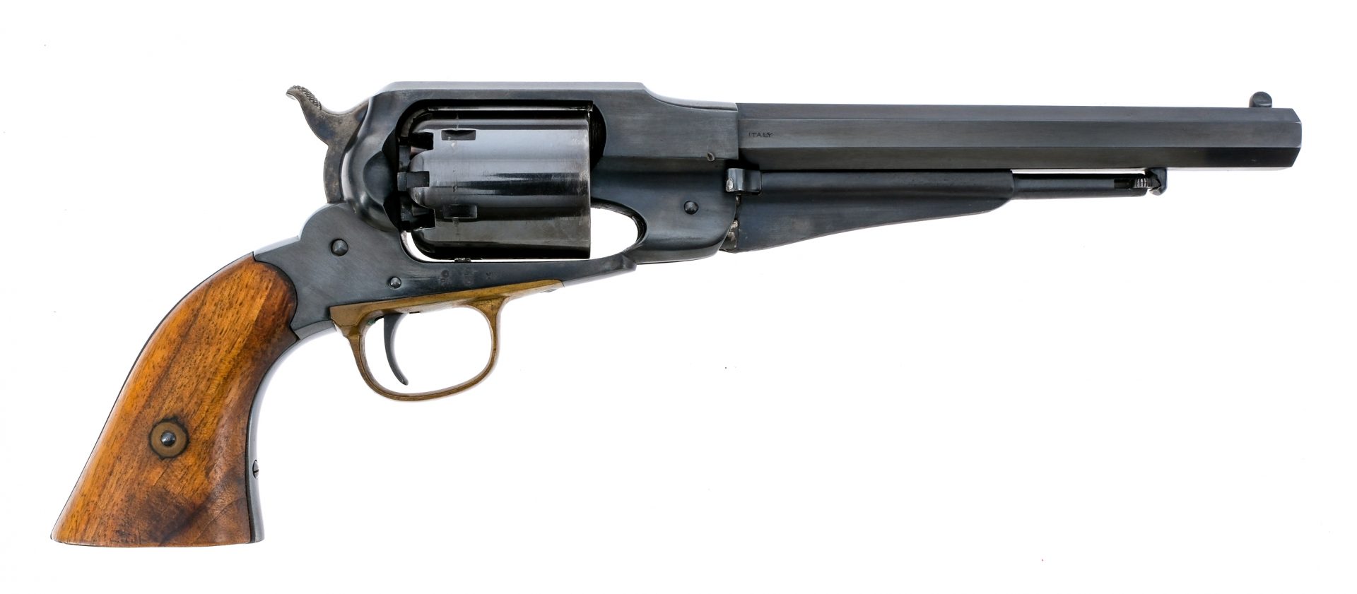 Description Navy Arms/Uberti 1858 Remington in .44 caliber with a six round capacity and a 8″ octagon barrel. Made in Italy by Uberti for Navy Arms in 1961. Smooth wood grip plates. Brass trigger guard. Blued trigger, frame, cylinder and barrel. Case colored checkered hammer. Under barrel ramrod. Rear notch and front fixed post sight. Comes in a lined wooden locking case with powder flask, 44 bullet mold and a few old lead balls. Black Powder Cap & Ball revolver, No FFL required and ships to MOST buyers homes. Condition: Good with light scratches and touches of rust inside the cylinder. The wooden case is missing key and has large crack to the top, damaged sides and damaged liner. Clean rifled bore. Barrel Length: 8″ Serial: 2079 Manufacturer: Navy Arms Uberti Year: 1961 Caliber: .44 Model: 1858 Remington
