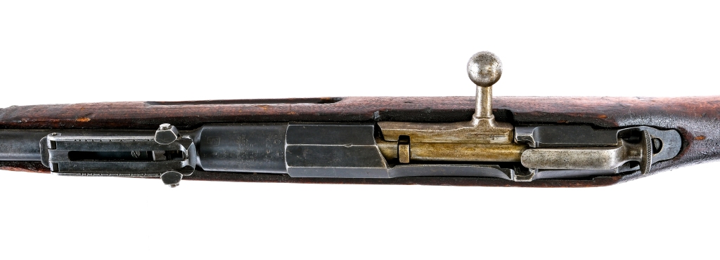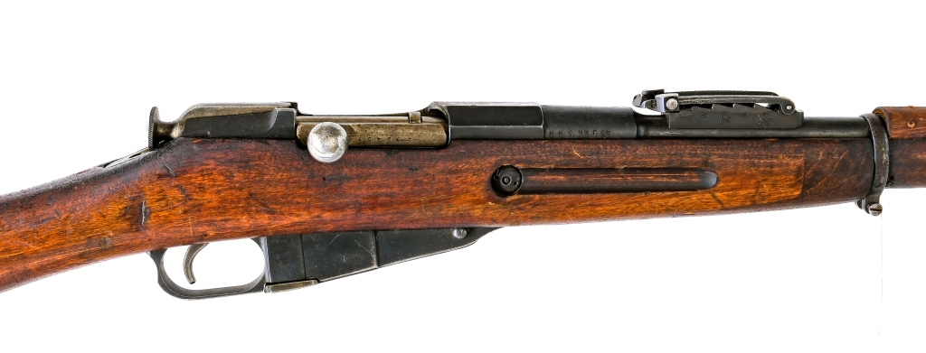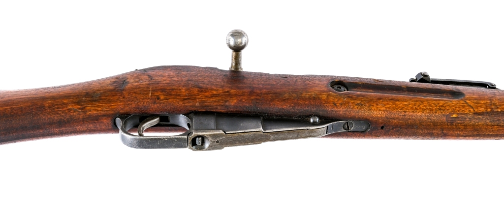 Description New England Westinghouse Company Model 1891 (American Mosin Nagant)-( Russian Three Line Rifle ) in 7.62x54mmR with a five round capacity and a 32″ barrel. Import marked on the muzzle end of barrel by C.A.I. ST. ALB. VT.-Century Arms. Finish worn butt plate. Smooth wood stock with front forend finger splice. Blued trigger guard, trigger, hexagon receiver and barrel. Under barrel removable cleaning rod. Rear flip up adjustable and front fixed blade sight. Metal loops for mounting a shoulder sling. Finnish Military SA proof marked barrel shank. D marked barrel shank for the D-166 cartridge. Force matching serial number on the bolt and barrel shank. Must ship to a C&R or FFL holder. Condition: Fair with scratches, wood dings, finish wear and wood crack to the left side of stock and front forend left side. Missing the front sight blade. The rifled bore has light rust within rifling grooves with strong visible rifling. Barrel Length: 32″ Serial: 590457 Manufacturer: New England Westinghouse Year: 1915 Caliber: 7.62x54mmR Model: M91 Mosin Nagant Book# 06744