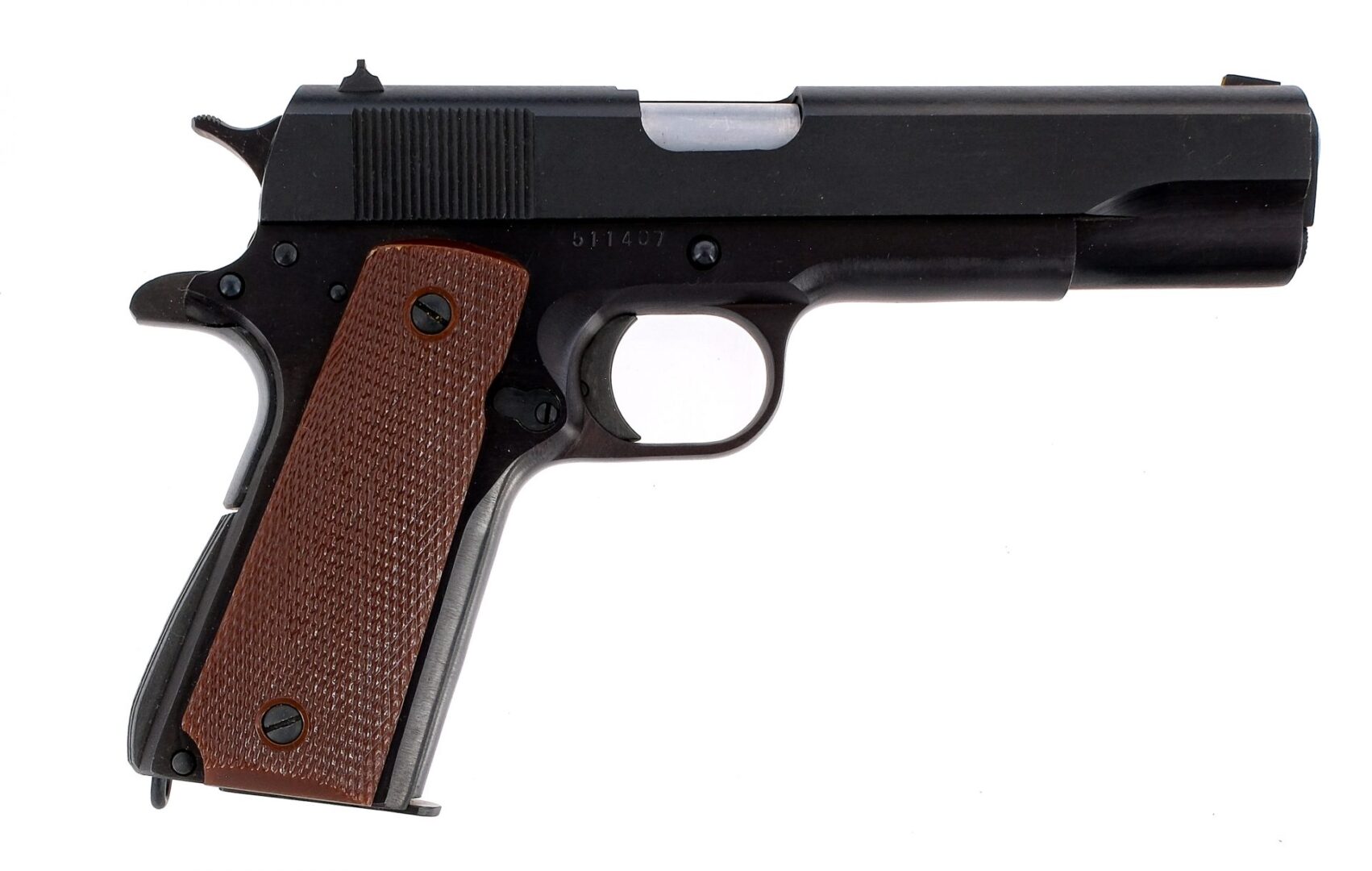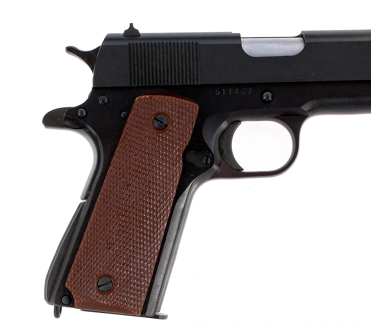Description UPDATE: Appears to be unfired. These were made with forged steel 30% stronger at the time than Colts steel. Norinco 1911A1 chambered in .45 ACP with two, seven round removable magazines and a 5″ barrel. Manufactured in China by Norinco and imported by C.A.I. ONT.CA, marked on the left side of the frame. Blued steel frame with lanyard loop and checkered plastic grips. Single action trigger and hammer. Frame mounted manual thumb safety and grip depression safety. Blued serrated slide with fixed white three-dot iron sights. Comes in its factory box with matching serial number, manual, cleaning rod/brush, and two magazines. One of the magazines is still sealed. Must ship to a FFL holder. Condition: Very good with some scratches and dings on the metal, mostly on the slide. Bright and clean rifled bore. Barrel Length: 5″ Serial: 511907 Manufacturer: NORINCO Caliber: .45 ACP Model: 1911A1 Book# 04641