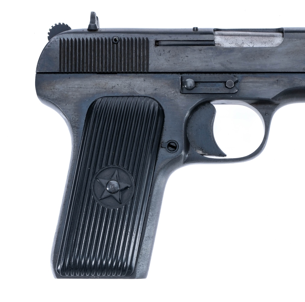 Description Chinese Norinco 54-1 Tokarev chambered in 7.62x25mm with a 4.5″ barrel. Manufactured in China by Norinco and imported by CSI, marked on the left side of the slide. Blued steel frame with ribbed polymer grips and lanyard loop. Frame mounted manual thumb safety. Push button magazine and textured slide stop. Single action trigger and hammer. Blued serrated slide with fixed blade and notch iron sights. Matching frame and slide. NO MAGAZINE INCLUDED. Must ship to a FFL holder. Condition: Good with light scratches and cosmetic handling wear. Light wear on the internals and moving parts from normal operation. Spots and speckling of metal oxidation throughout. Bright and clean rifled bore. Barrel Length: 4.5″ Serial: 37000745 Manufacturer: NORINCO Caliber: 7.62x25mm Tokarev Model: 54-1 Book# 07640