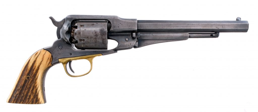 May 7, 2025Description Remington New Model 1858 in .44 caliber with a six round capacity and a 8″ octagon barrel. Natural antler grip…
