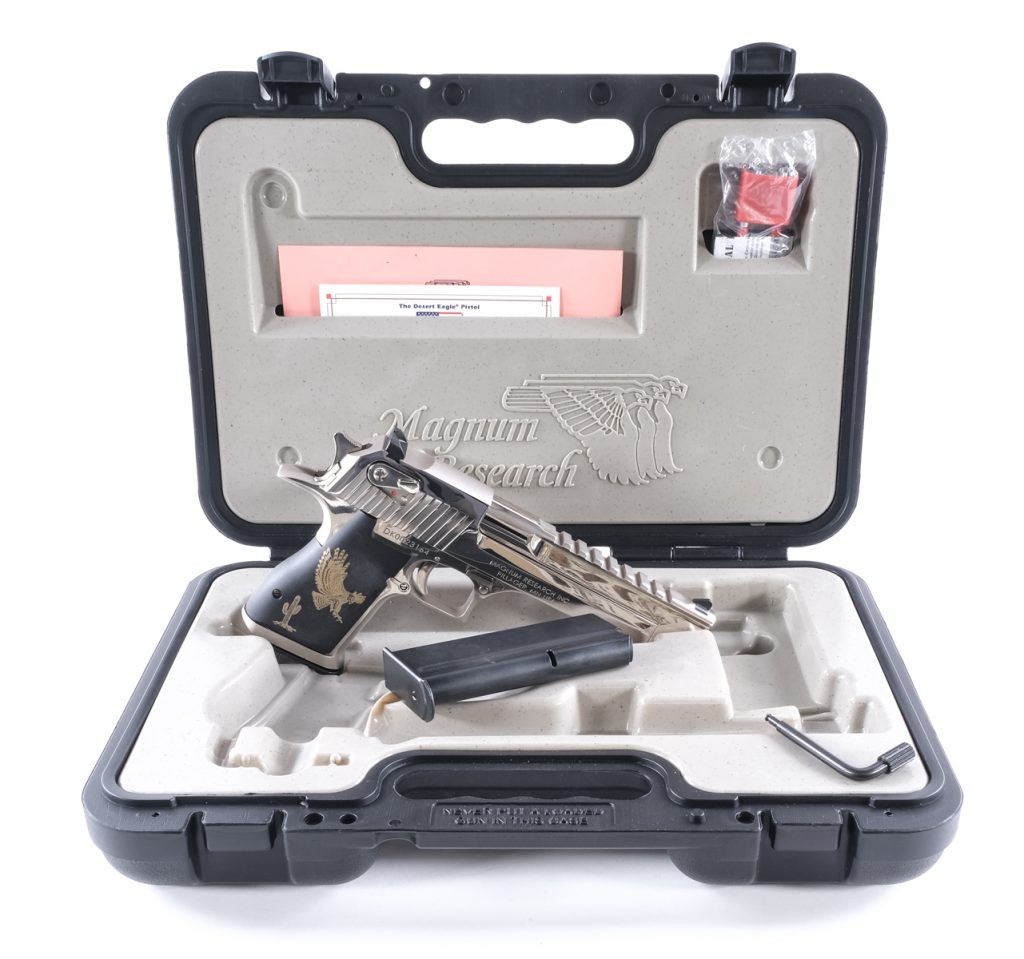 April 24, 2025Description Magnum Research Desert Eagle chambered in 50 AE (Action Express) with two, seven round removable magazines and a 6″ barrel….