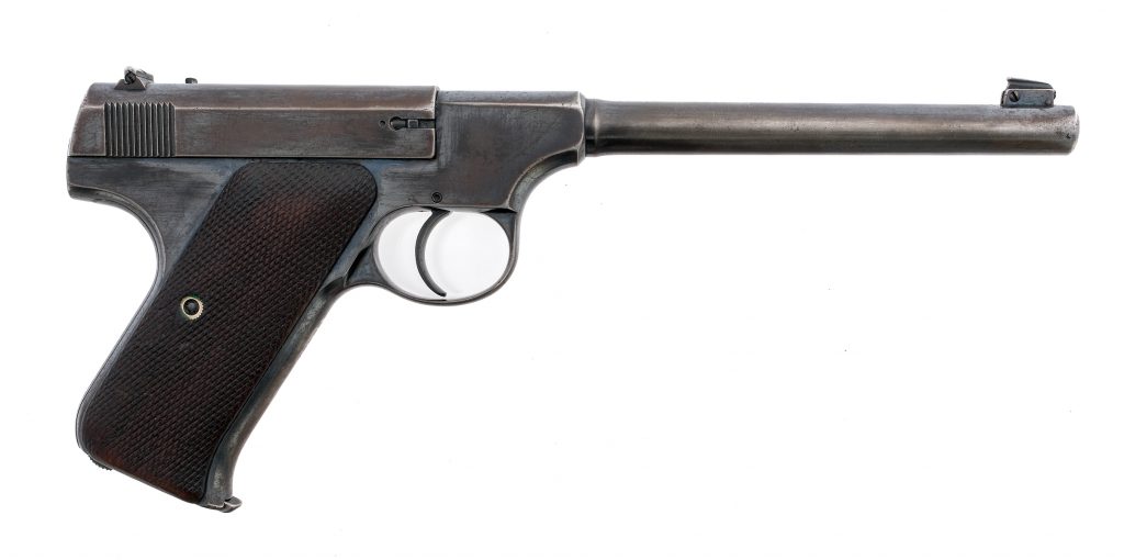April 25, 2025Description Colt Pre-Woodsman in .22 Long Rifle with one, ten round removable magazine and a 6.5″ barrel. Checkered wood grip plates….