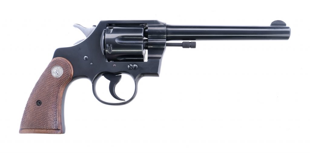 Description Colt Official Police in .22 Long Rifle with a six round capacity and a 6″ barrel. Checkered wood grip plates….