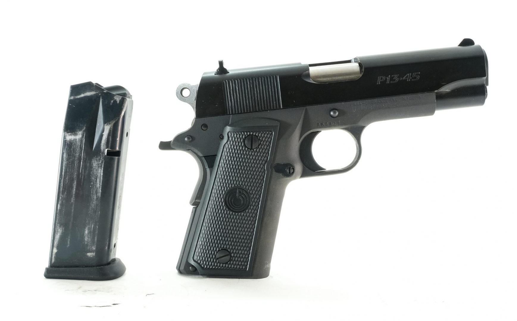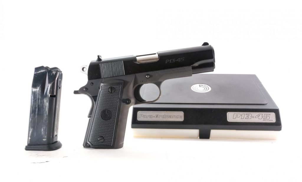 Description Para Ordnance model P13-45 in .45 ACP with (1) ten round removable magazine with a 4″ barrel. Checkered plastic grip plates. Parkerized frame, serrated trigger and hammer. Black finished serrated slide. White dot fixed iron sights. Left side of frame serrated slide release and rear serrated slide stop safety. Grip depression safety. Left side of grip serrated magazine release button. Comes with its factory hard case with matching serial number and instruction manual. Must ship to a FFL.