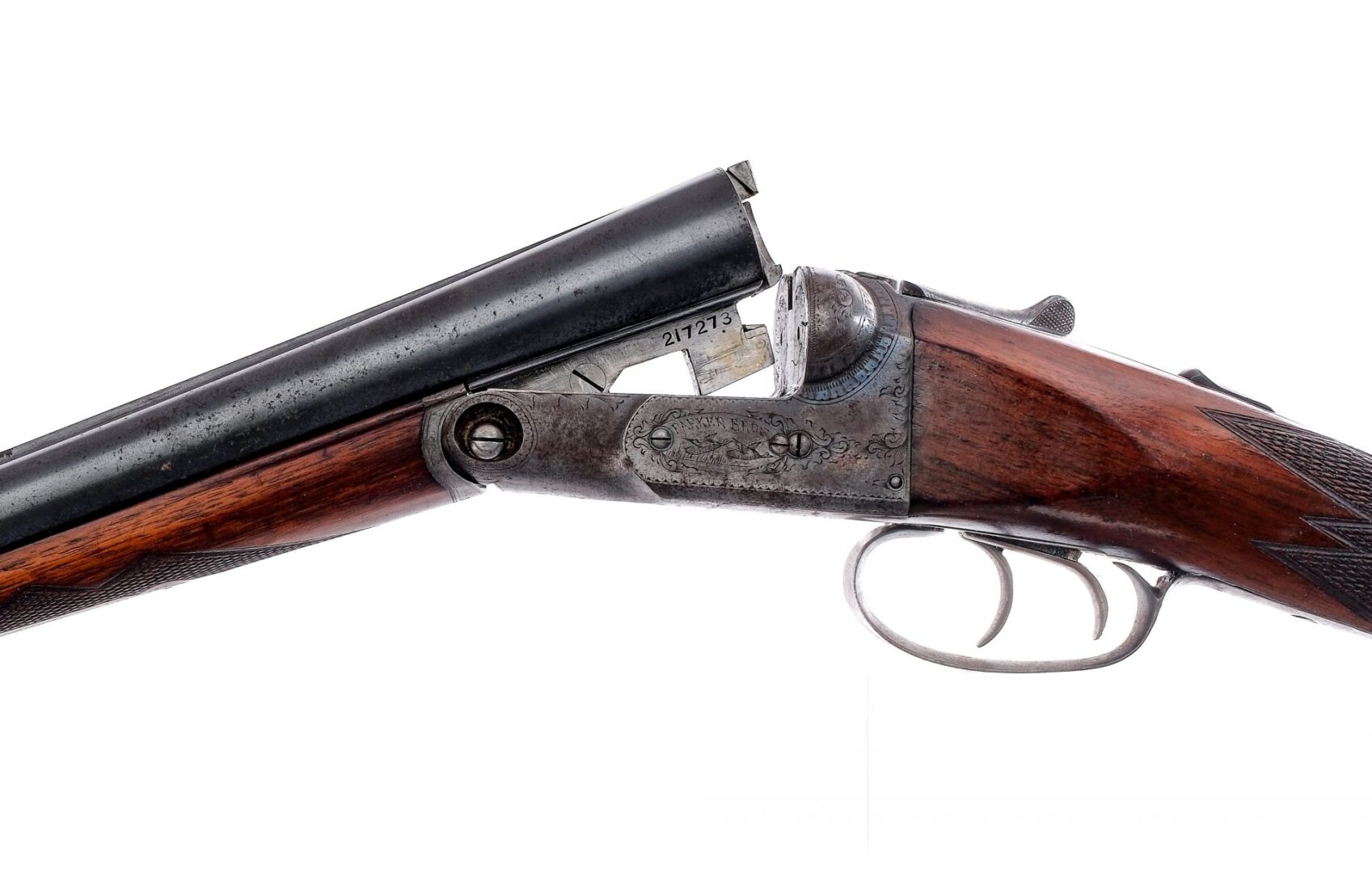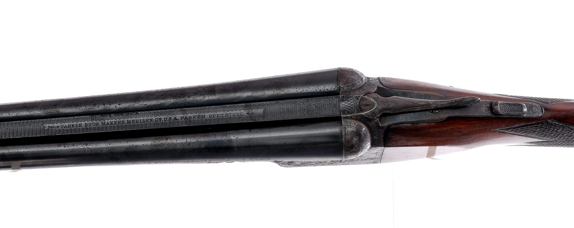 Description Parker Bros P2 Grade (GH) 16 gauge hammerless shotgun chambered in 16 gauge for 2 3/4″ shells with blued 25″ Special Steel side by side double barrels. The left bore has a fixed MOD choke and the right bore has a fixed CYL choke. Patinated case colored engraved lock, lever, tang, and trigger guard. Automatic tang safety and double triggers. Checkered wood splinter forend and straight grip stock with leather butt pad. Dual bead sights. The top of the barrel is marked “PARKER BROS. MAKERS. MERIDEN. CT. U.S.A. PARKER SPEC. STEEL”. Both sided under the barrels is marked “OVERLOAD PARKER BROS PROVED”. “PATD’D OCT 25 1910” is marked on the water table. In the “Parker Gun Identification & Serialization” book this serial number is listed as having a capped pistol grip stock, but this one has a straight stock. But the straight long grip tang is serialized and matches the water table, barrels, and forend. Condition: Good with spots and speckling of metal rust throughout most of the metal parts. Most of the bluing is still intact, most of the case coloring has patinated. Scratches, scuffs, and dings on the wood. A large section of the end of the butt stock has been professionally extended showing a thin line at the wood extension. The addition is well done and the stock is solid. The bores are very clean and bright. Barrel Length: 25″ Serial: 217273 Manufacturer: PARKER BROS. MAKERS Gauge: 16 Ga. Model: Grade 2 Hammerless Book# 03147