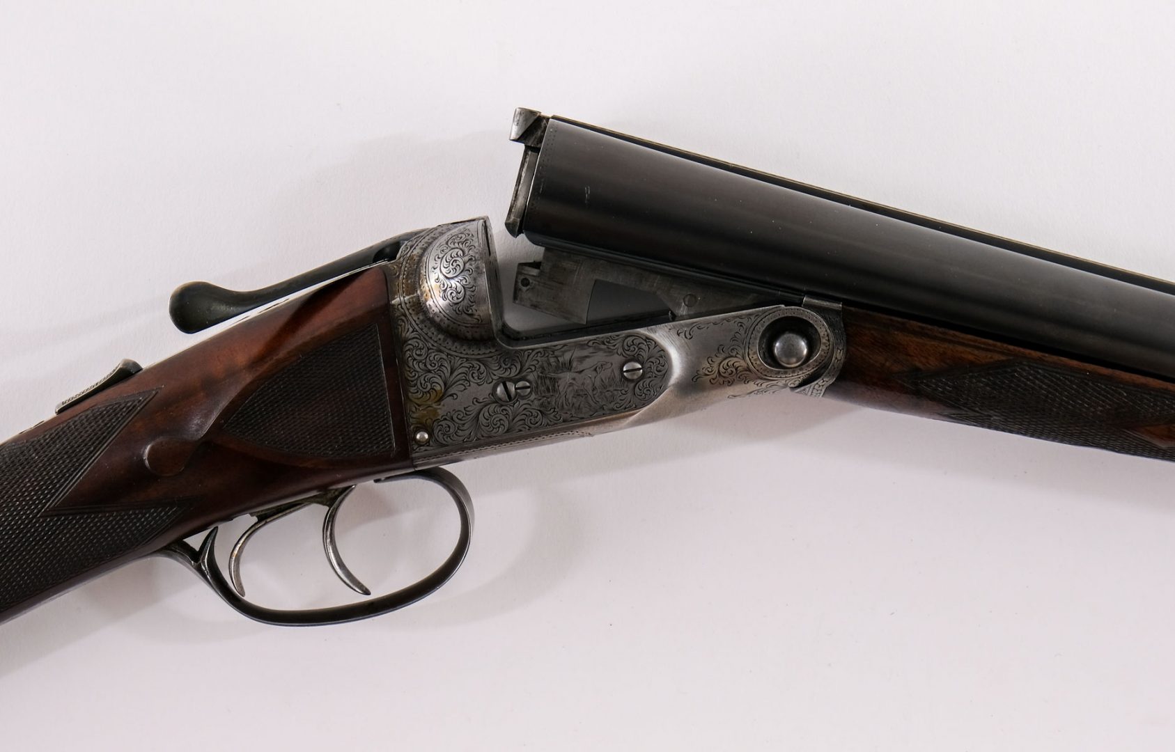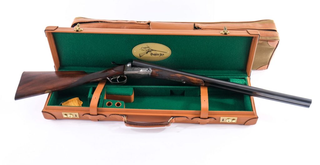 Great example of a higher grade Parker with ejectors manufactured in 1934. According to the reference books this was actually one of the last Parkers to roll out of the factory before Remington took over. Single brass bead sight on the solid matte rib, barrel marked “PARKER BROS. MAKERS MERIDEN, CT. U.S.A TITANIC STEEL” 12ga 2 3/4 inch chambers with ejectors. Beautifully engraved receiver. Tight scroll, with pheasants taking flight on the underside, pointers on sides. Double trigger, automatic tang safety. Fancy diamond checkered splinter forearm with engraved hardware, and straight English stock checkered with raised design at wrist and engraved skeleton buttplate over a checkered butt. Includes aftermarket leather bound trunk style case, canvas outer cover. *C&R Eligible Condition: Very Good. Appears all original. Bluing on barrels is excellent with over 90% original remaining. No signs of re-blue, only some storage and handling scratches. Some edge wear at muzzle and breech. Case coloring is absent but the engraving is still deep and sharp. Wood is excellent with just scratches and dings. Stock may have been lightly sanded and retouched but done so tastefully and to original style. Bore Diameter @ 6″ from muzzle= .725 Wall Thickness @ 6″ from muzzle = .030 (left) .034 (right) LOP @ Heel= 14 5/16″ LOP @ Toe= 14 7/8″ Choke L= .695 (FULL) R= .710 (MOD) Drop @ Comb = 1 1/2″ Drop @ Heel = 2 3/8″ Cast Off