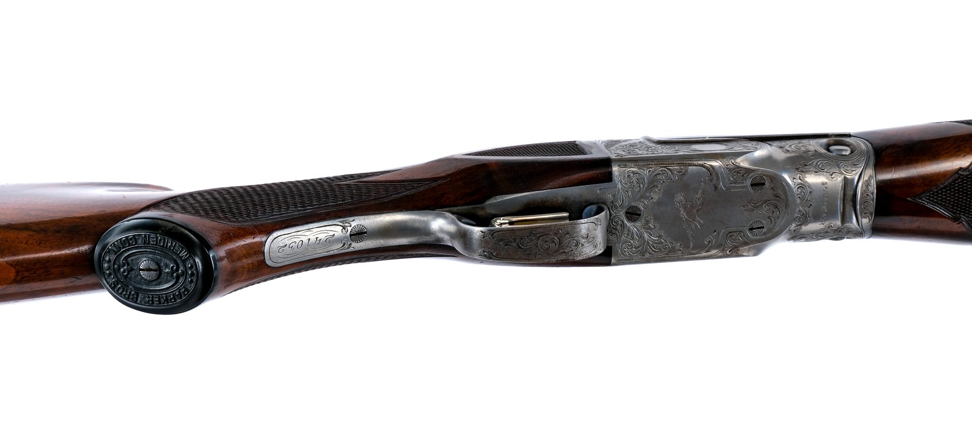 Description Parker SC Grade 4 chambered in 12 gauge for 2 3/4″ shells, with a single shot capacity and a 32″ vented rib single barrel. Manufactured in 1937 with serial number 241032. Blued barrel and rib. Engraved silver/in the white lock, lever, and trigger guard. The engraving shows scrollwork with a bird on the bottom of the lock. Automatic ejectors. Polished silver trigger. Checkered wood forend and capped pistol grip stock with Robinson adjustable butt pad. The pistol grip cap is marked “PARKER BROS MERIDEN CONN”. The stock has a plaque inlayed into the bottom of the stock with the previous owners initials “H.L.M.”. Dual bead sights with white front. Comes with a leather carrying/travel case that also has the initials. Must ship to a FFL or C&R holder. Condition: Overall fair, cosmetically Good/Very good with some scratches, contact marks, and handling wear. Spots of finish patina. The bluing has plumed. Light scratches and dings on the wood. Wear on the butt pad and insert. Clean smooth bore. This shotgun is overall FAIR because it needs gunsmith attention, the trigger appears to be dead and the ejectors activate without pulling the trigger. Sold AS-IS. The lather case has heavy wear and the carrying strap is broken. Barrel Length: 32″ Serial: 241032 Manufacturer: PARKER BROS. MAKERS Gauge: 12 Ga. Year: 1937 Model: SC Grade 4 Trap Gun Book# 03681