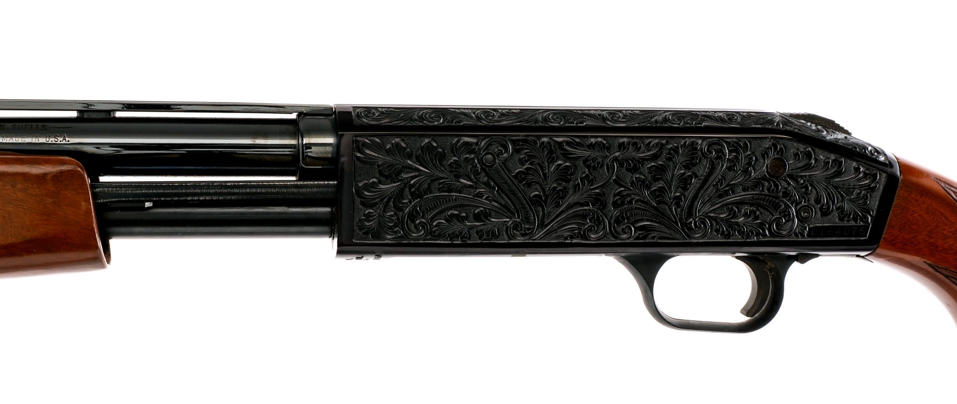 Description Pedersen Model 4000 Custom in .410 gauge with a five round capacity and a 26″ FULL fixed choke top rib vented barrel. Made in North Haven Connecticut. Rubber butt pad. Checked wood stock and front forend. Black composite trigger guard. Blued trigger guard, receiver, magazine tube and barrel. Rear receiver slide button safety. Rear trigger guard action release. Front fixed white composite bead sight. Must ship to a FFL holder. Condition: Very Good with light scuffs and handling wear. Clean rifled bore. Barrel Length: 26″ Serial: G164075 Manufacturer: Pedersen Gauge: 410 Model: 4000 Custom Year-Range 1973-1976 Book# 05045