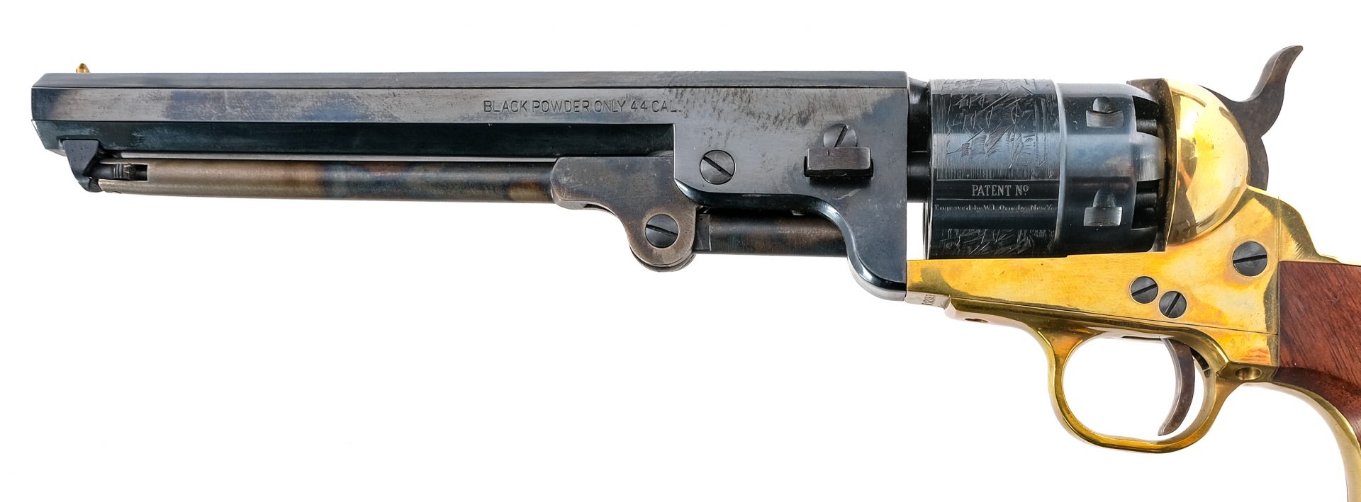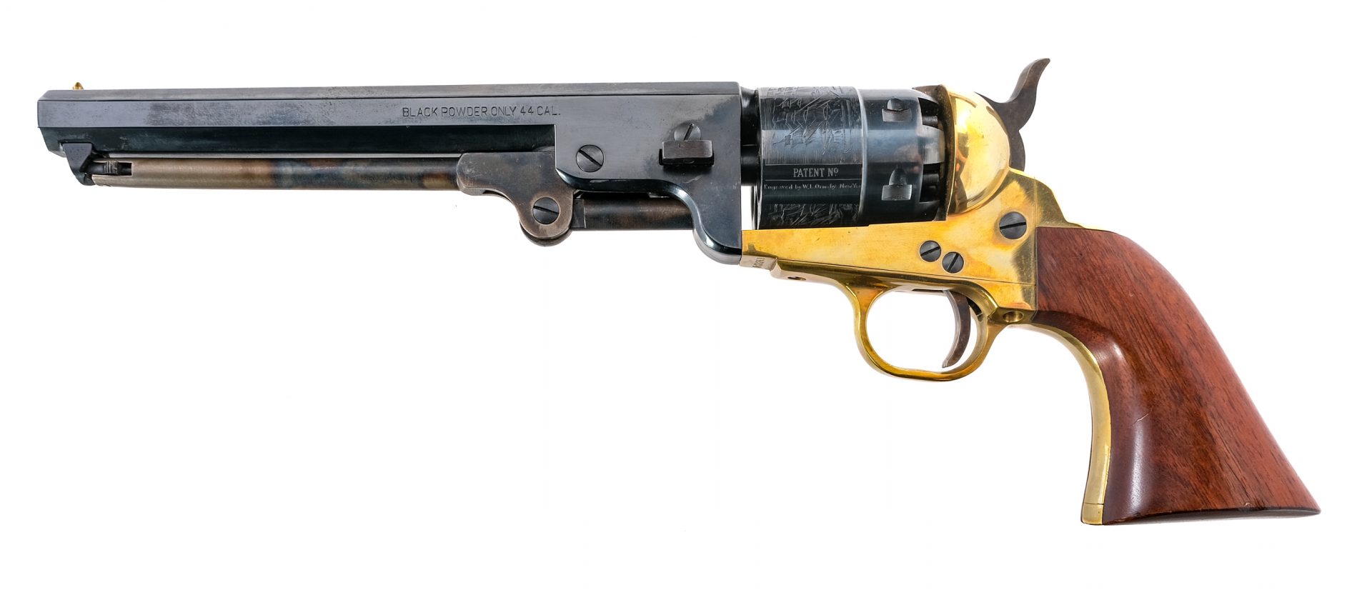 Description Flli Pietta 1851 Navy reproduction in .44 caliber with a six round capacity and a 7.5″ octagon barrel. Made in Italy. Smooth wood grip plates. Brass frame and backstrap. Case colored trigger, ramrod and serrated hammer. Blued cylinder and barrel. Under barrel ramrod. Front fixed brass bead sight. Black Powder, No FFL required and ships to buyers home. Condition: Good with light scuffs, touch of rust on barrel and handling wear. Clean rifled bore. Barrel Length: 7.5″ Serial: 612269 Manufacturer: Flli Pietta Year: 2012 Caliber: 44 Model: 1851 Navy