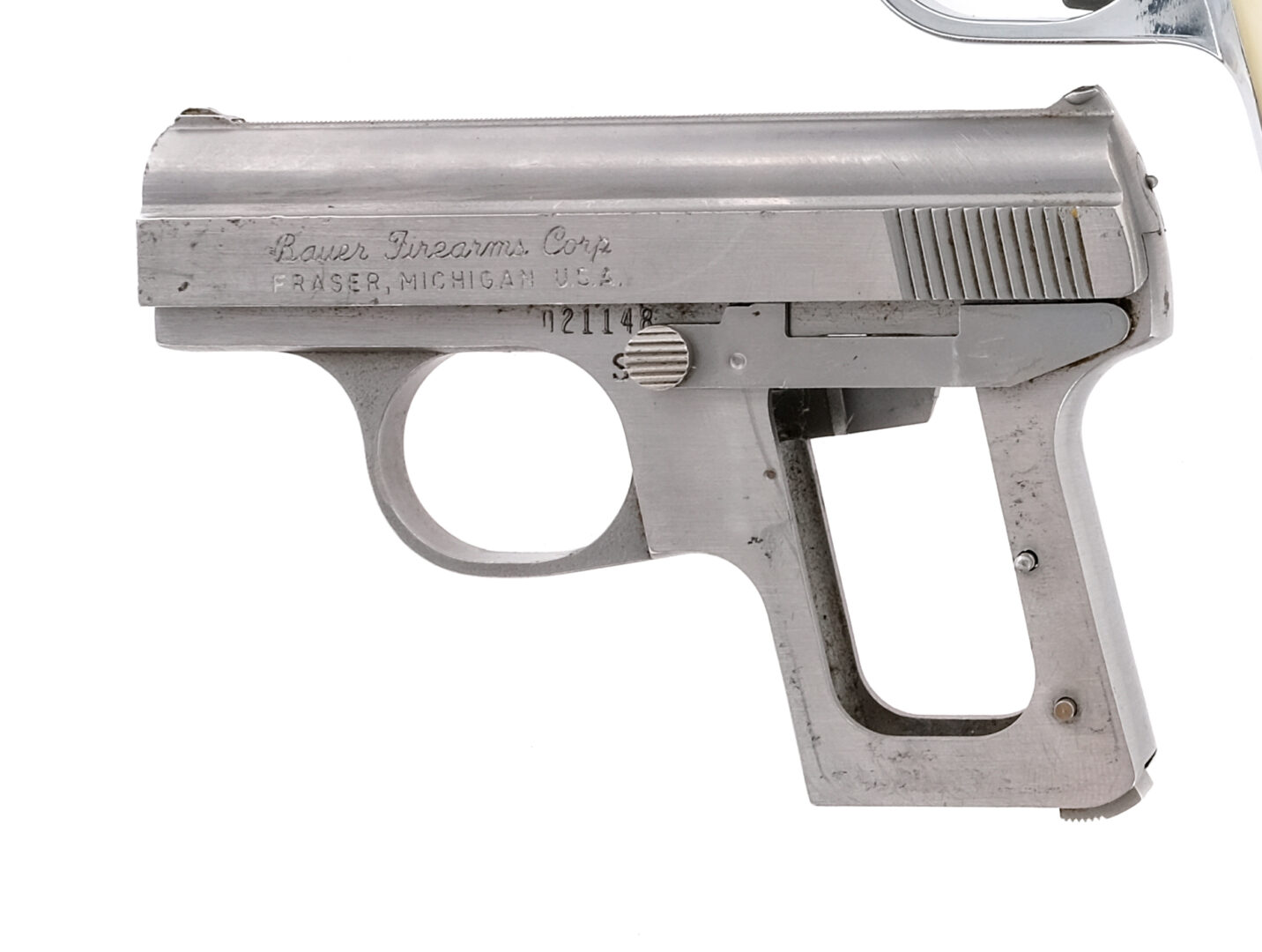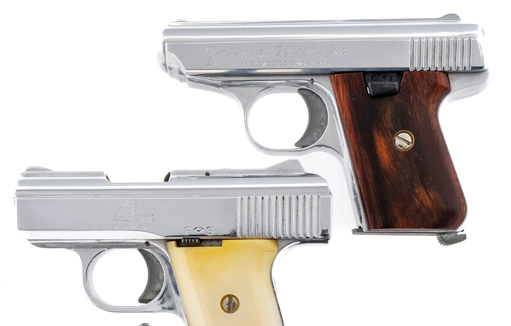 Description This lot is for 3 semi-automatic pocket pistols: The first is a Jennings model J-22 chambered in .22 Long Rifle with one, 6 round removable magazine and a 2.5″ barrel. The 2nd is a Raven Arms model MP-25 in .25 ACP caliber with a 2.5″ barrel missing its magazine. The third is a Bauer Automatic in .25 ACP with a 2″ barrel missing its magazine among other parts like the trigger and grip plates. This lot must ship to an FFL holder. Condition: Fair / Good with minor various scratches along the slides of the Jennings and Raven. They both have clean rifled bores. The Baur has deep scratches and touches of rust. Missing parts. It’s bore has touches of oxidation. SOLD AS-IS Barrel Length: 2.5″, 2.5″, 2″ Serial: 486907, 1142559, 021148 Manufacturer: JENNINGS, RAVEN ARMS, BAU Caliber: .22 LR, .25 ACP Model: J-22, MP-25, Automatic 25 Book# 01069, 01039, 01043
