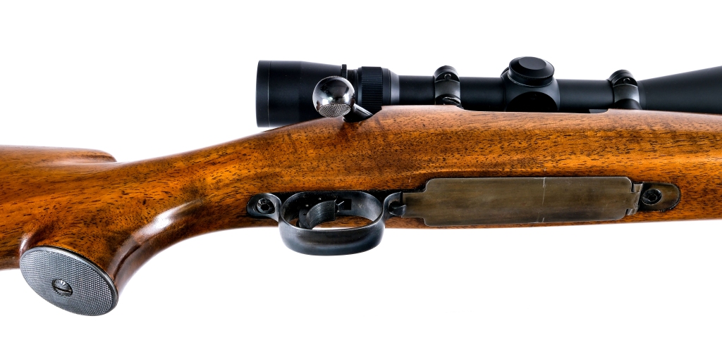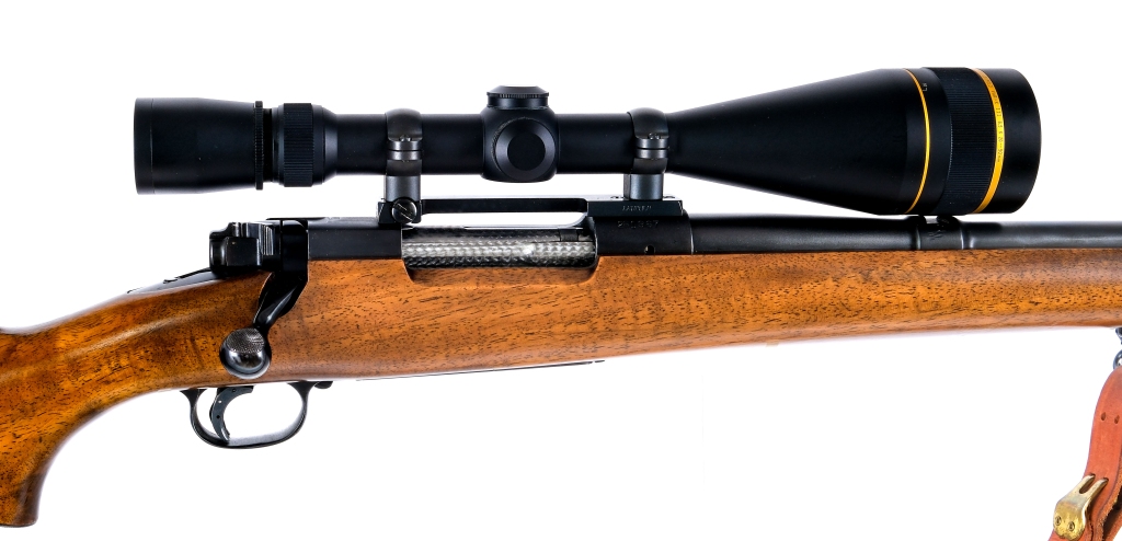 Description Winchester model 70 chambered in .220 Swift with a four round internal magazine and a 22″ barrel. Manufactured in 1953 with serial number 281967. Matte blued barrel and receiver. The receiver is drilled and tapped and mounted with a Leupold VARI-X III 6.5×20-50mm scope. The rear sight has been removed, front blade sight. Blued bolt handle, floor plate, trigger, and trigger guard. Jeweled bolt body and magazine follower. Rear bolt safety lever. Smooth wood pistol grip stock with checkered metal butt plate. Front and rear sling swivels with mounted leather sling. Must ship to a FFL or C&R holder. Condition: Good/Very good with light scratches, sharp edge wear, and cosmetic handling wear. Some small metal dings/marring on the right side of the barrel. Light wear on the internal/moving parts from normal operation. Some spots of finish patina, heavier patina on the floor plate and trigger guard. The stock appears to have been cleaned at some point. Light scratches and dings on the stock. Bright and clean bore with strong visible rifling. Barrel Length: 26″ Serial: 281967 Manufacturer: WINCHESTER Year: 1953 Caliber: .220 Swift Model: 70 Book# 08281