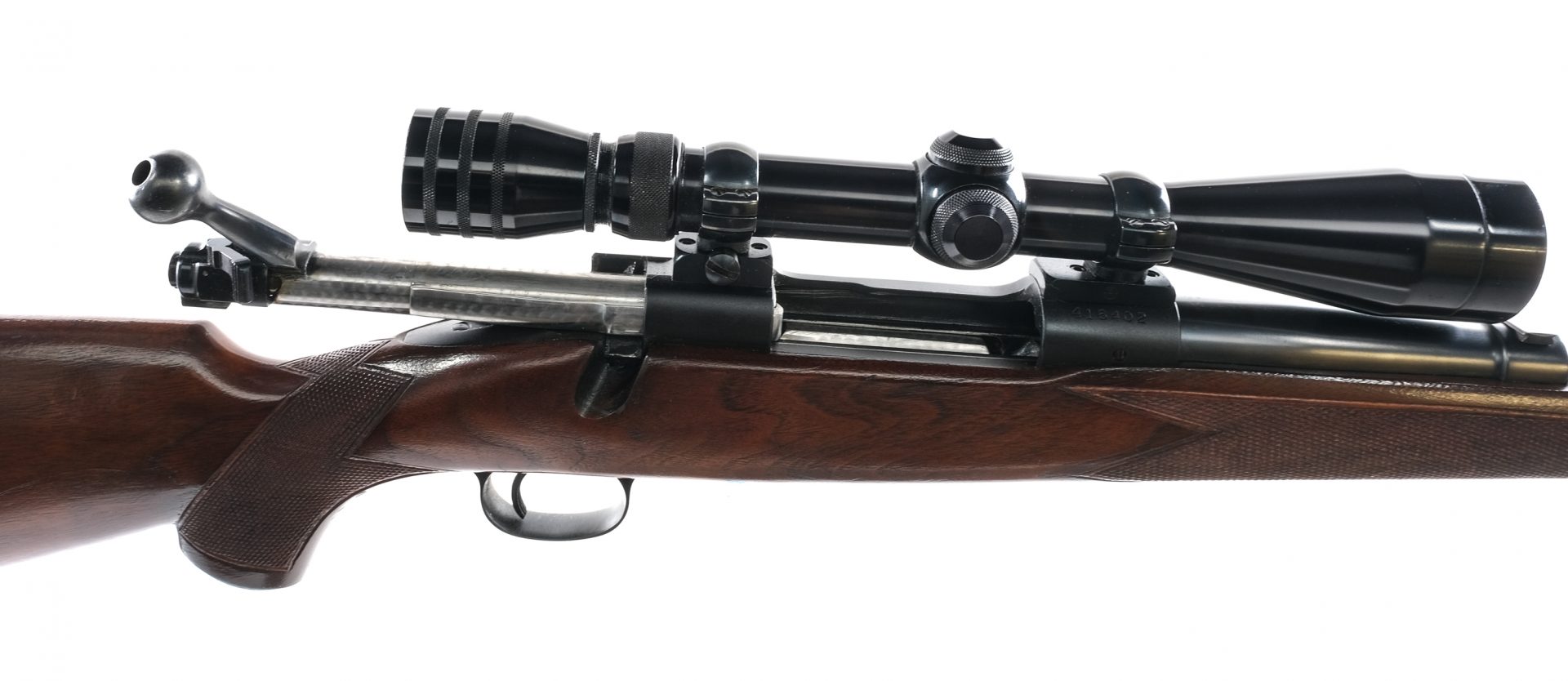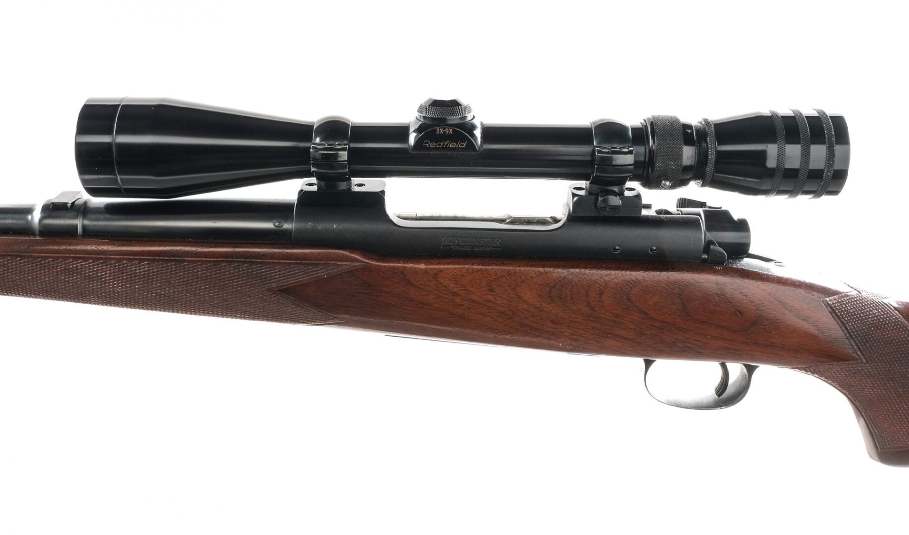 Description Pre 1964 Winchester Model 70 Super Grade chambered in .243 Winchester with an internal magazine and a 24″ barrel. Blued barrel, receiver, magazine floorplate, serrated trigger, and trigger guard. Jeweled bolt body and blued bolt handle. Checkered wood Monte Carlo stock with checkered metal butt plate. Fixed hooded front blade. The receiver is drilled and tapped and mounted with a 3x-9x Redfield scope with clear and intact glass. Floorplate marked “Super Grade”. Front and rear sling swivels mounted with a leather sling. Must ship to FFL or C&R holder. Condition: Very good/Excellent with some scratches and marks on the finish from normal handling and storage. Some scratches, scuffs, and dings in the wood stock. The original checkering is still sharp. Clean bore with strong rifling. Barrel Length: 24″ Serial: 416402 Manufacturer: WINCHESTER Year: 1957 Caliber: .243 Winchester Model: Model 70 Super Grade