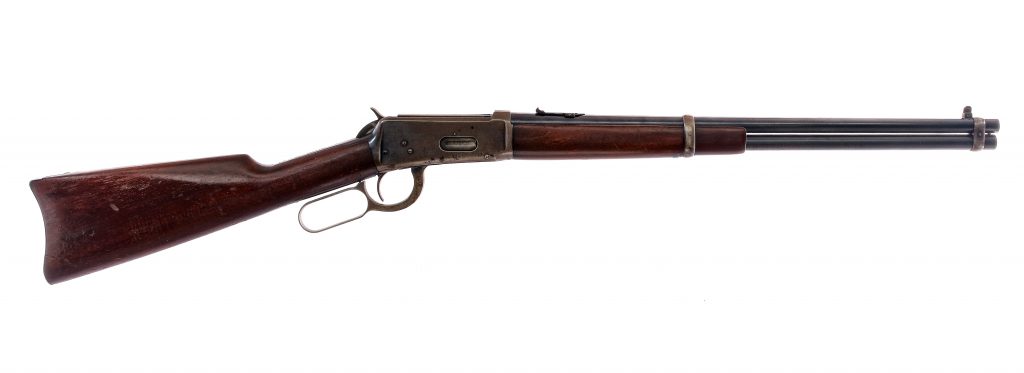 Description Pre 1964 Winchester 94 chambered in .25-35 Winchester with a tubular magazine and a 20″ barrel. Manufactured in 1920 with serial number 907300. Patinated blued barrel, magazine tube, frame, loading gate, hammer, trigger, and lever. Receiver mounted saddle ring. Smooth wood forend and straight stock with crescent metal butt plate. Fixed iron sights with multi aperture rear sight and fixed front blade. Must ship to a FFL or C&R holder. Condition: Fair with heavy finish patina, finish loss, and metal oxidation/pitting. Scratches, scuffs, and dings in the wood. The bore has a frosting of metal oxidation, but shows strong rifling. Barrel Length: 20″ Serial: 907300 Manufacturer: WINCHESTER Year: 1920 Caliber: .25-35 Winchester Model: 1894 Book# 03901