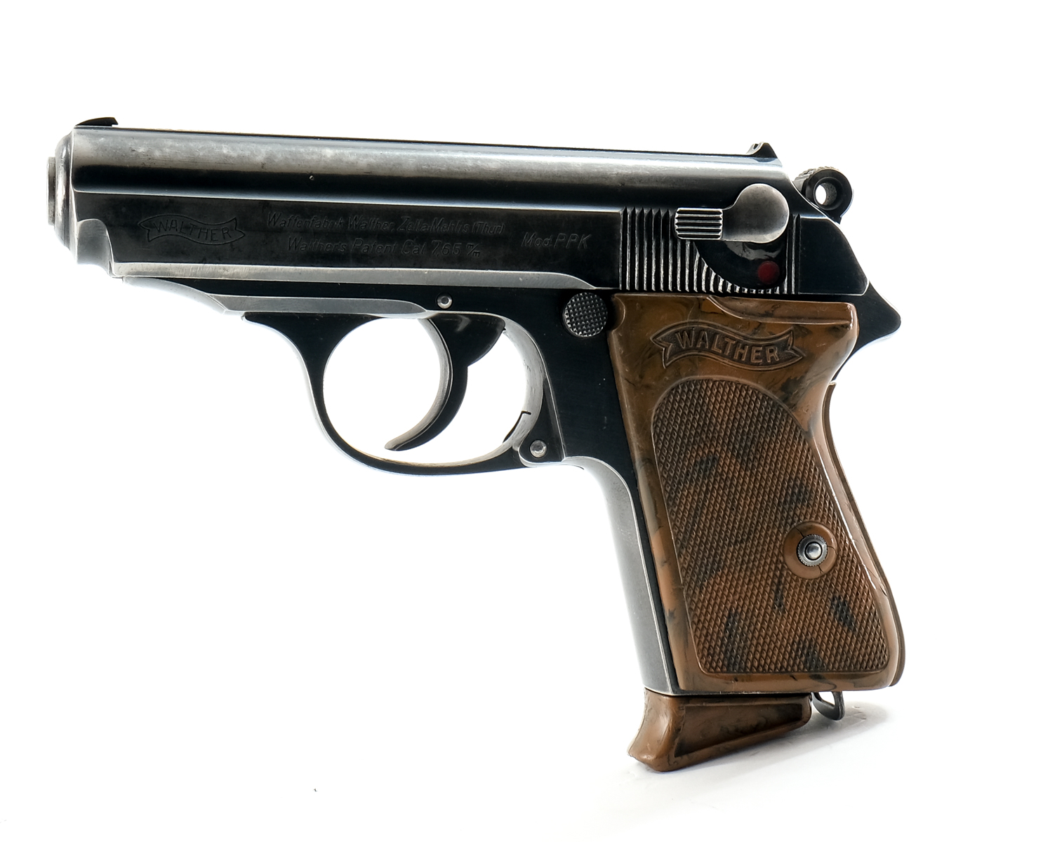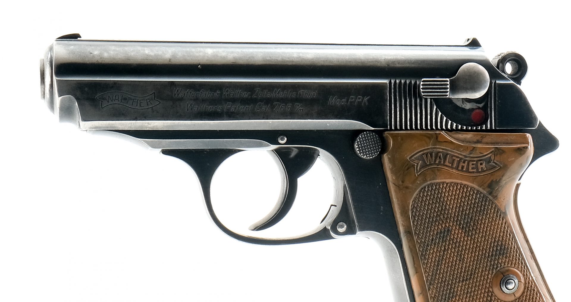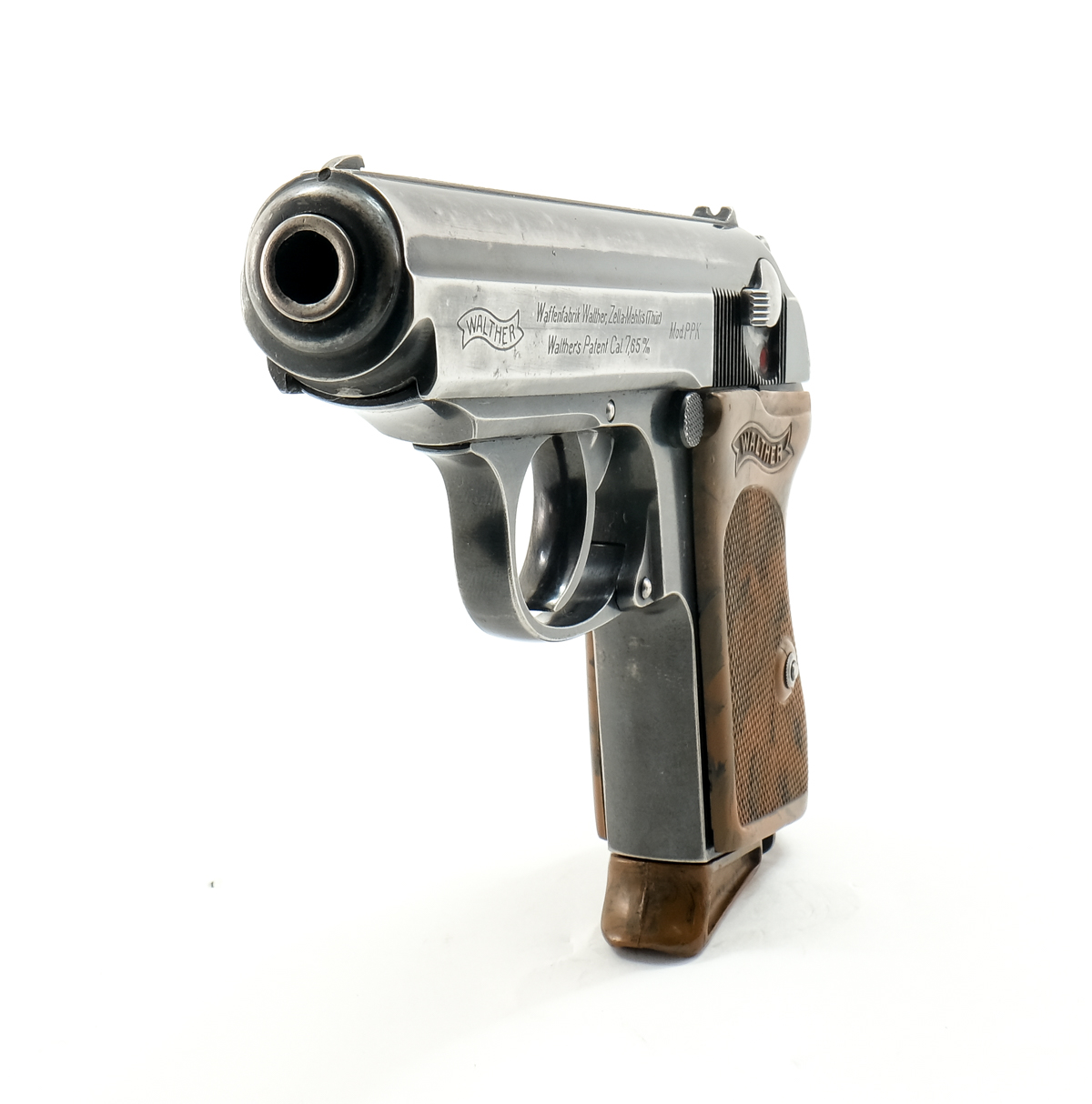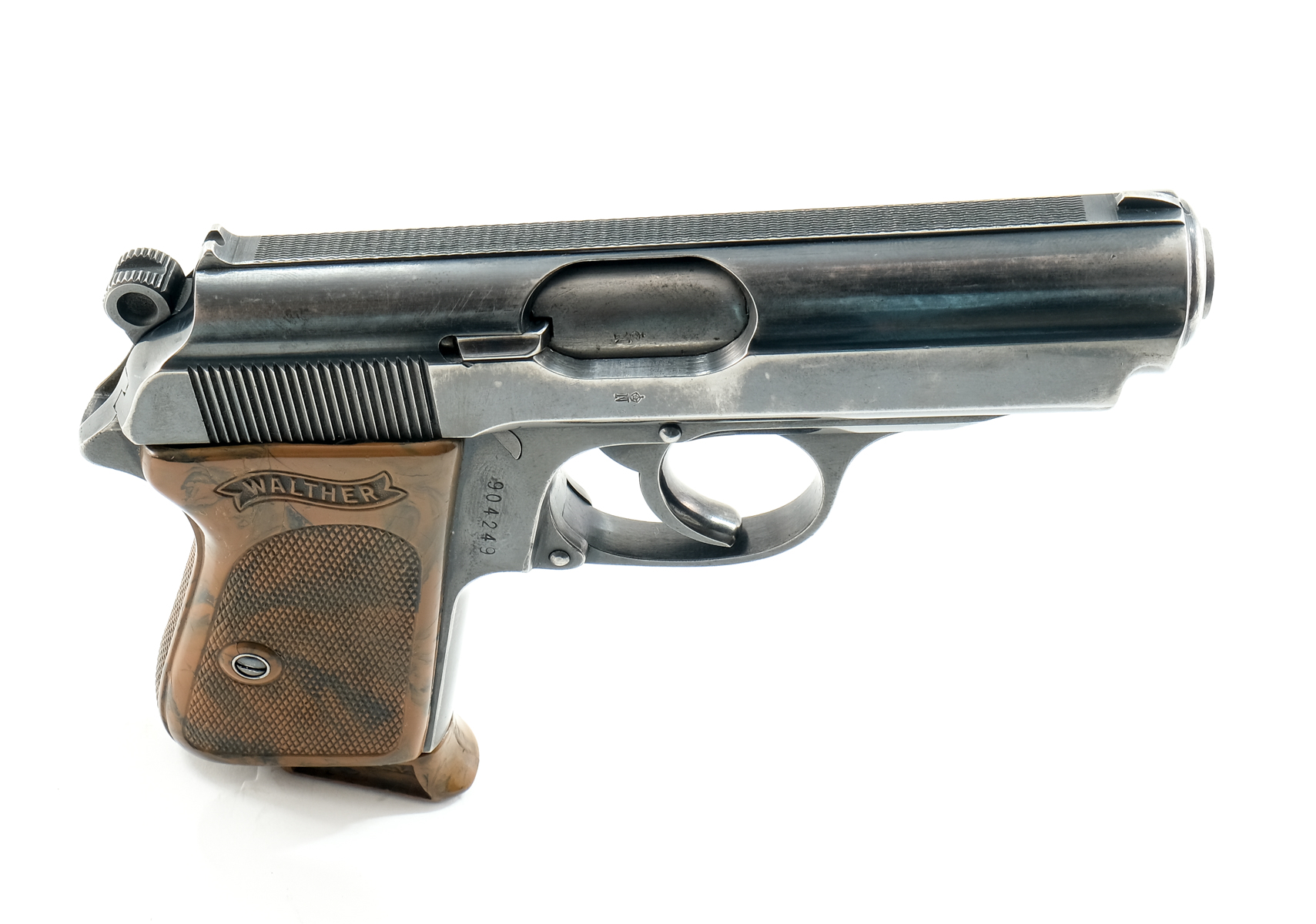 Description Walther PPK semi auto pistol chambered in 7.65mm (.32 ACP). This prewar commercial example with S/N 904249 manufactured in 1936 features a 3-1/4″ barrel with fixed front blade and u-notch rear sights, polished blued finish, wrap around bakelite grips with finger extension magazine. The slide is Walther-Banner marked with legend “Waffenfabrik Walther Zella Mehlis (Th?r) / Walther’s Patent Cal 7,65 m/m” and “Mod. PPK”. The slide is proofed “Crown / N” and there are no import marks. Must Ship to FFL or C&R holder