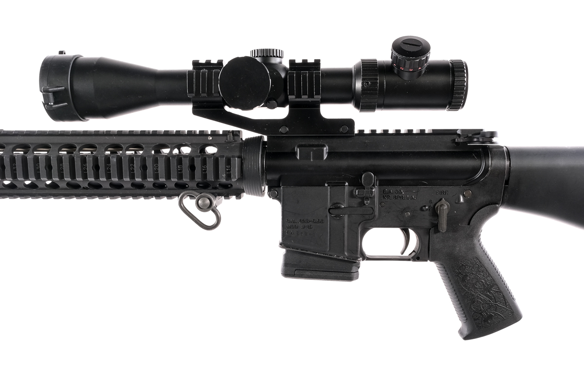 Description Essential Arms J-15 chambered in .223/5.56 with one, ten round M3 PMAG and a 20.5″ stainless steel threaded barrel with a mounted flash suppressor. Picatinny railed gas block and quad rail handguard. Flat top upper receiver mounted with a NcSTAR 4-16×44 scope with clear and intact glass. J-15 forged lower receiver with standard AR-15 controls, textured pistol grip, and fixed rifle stock. Front and rear sling swivel mounts. Must ship to FFL holder. Pre 1994. Condition: Good/Very good with general wear from normal handling and use, scratches, chatter marks, and sharp edge wear. Some spots of metal oxidation on the barrel, forward assist, and other small parts. Clean bore with strong rifling. Barrel Length: 20.5″ Serial: 27241 Manufacturer: Essential Arms Co. Caliber: 5.56x45mm NATO Model: J-15 Year-Range Pre 1994