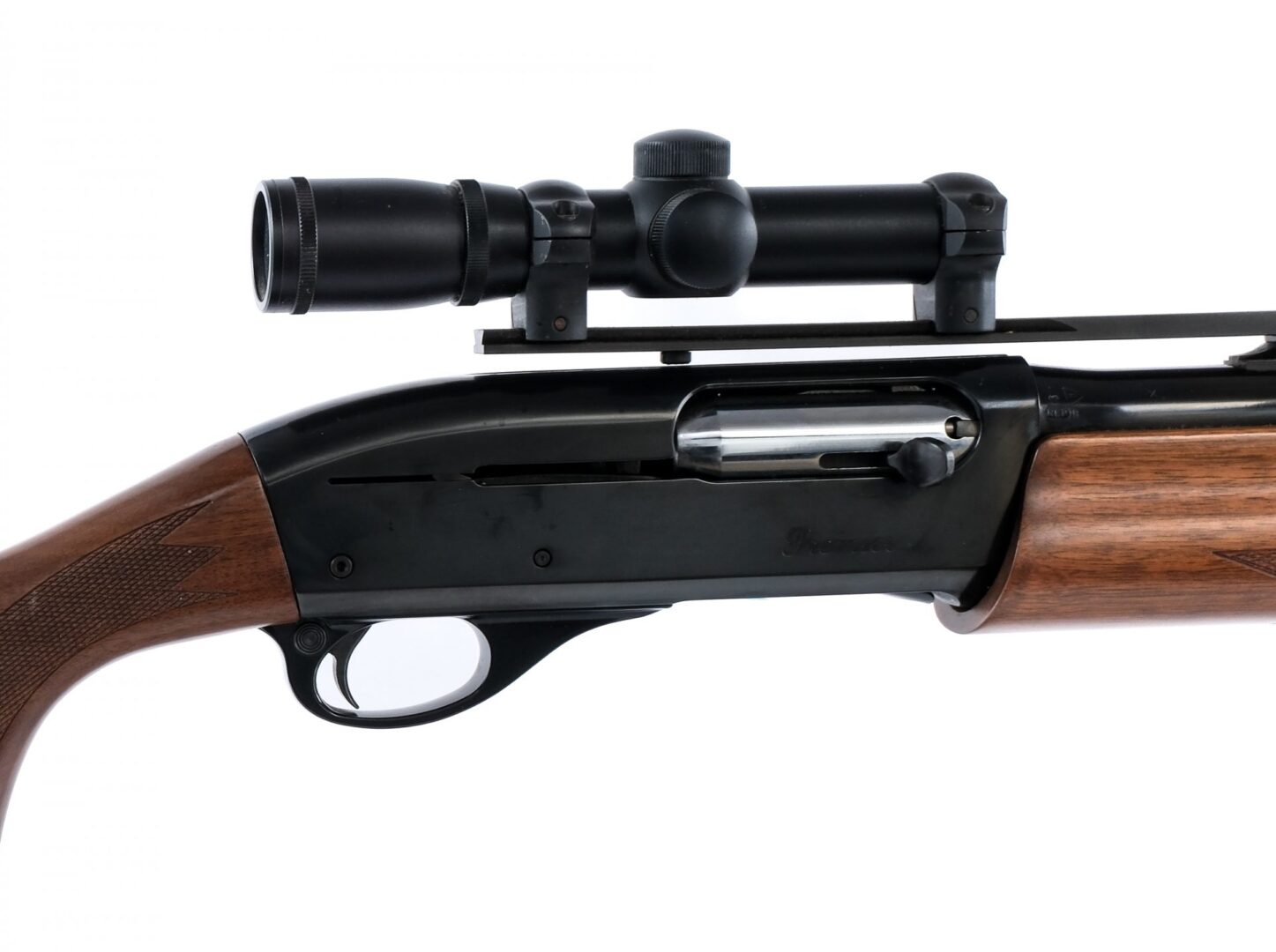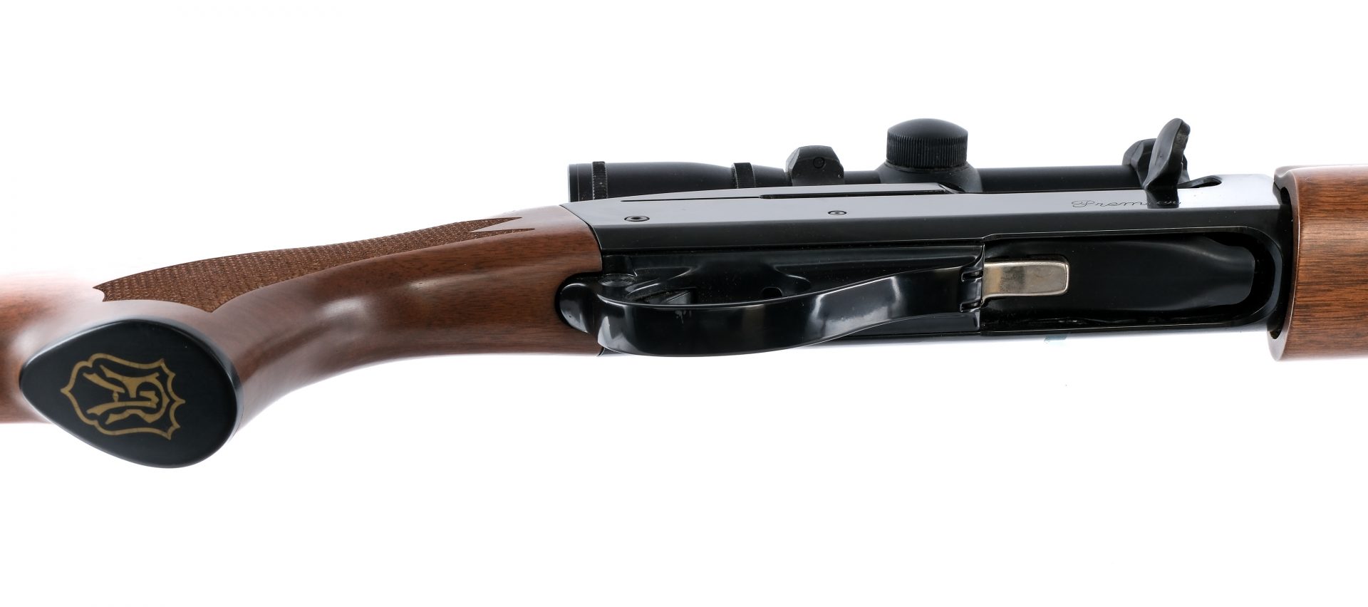 Description Remington 11-87 Premier in 12 gauge 2 3/4″-3″ with a four round capacity and a 21″ rifled barrel. Rubber butt pad. Checkered wood stock and front forend. Blued trigger guard, trigger, receiver and barrel. Rear trigger guard push button safety. Right side of receiver charging handle. Top of barrel has optics rail and rear mounted Charles Daly scope with clear glass and a duplex reticle. Metal eyelets for mounting a shoulder sling. Must ship to a FFL holder. Condition: Good/Very Good with light scuffs, handling wear and tiny touches of rust on the right side of receiver. Clean smooth bore. Barrel Length: 21″ Serial: PC331637 Manufacturer: Remington Gauge: 12 Year: 1991 Model: 11-87 Premier Book# 05606