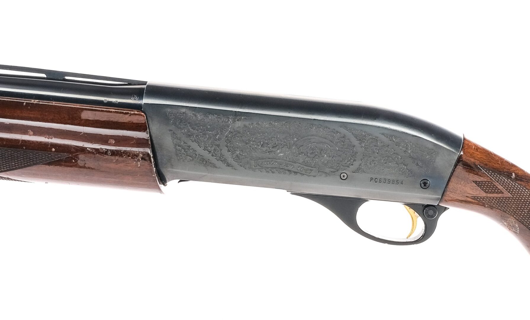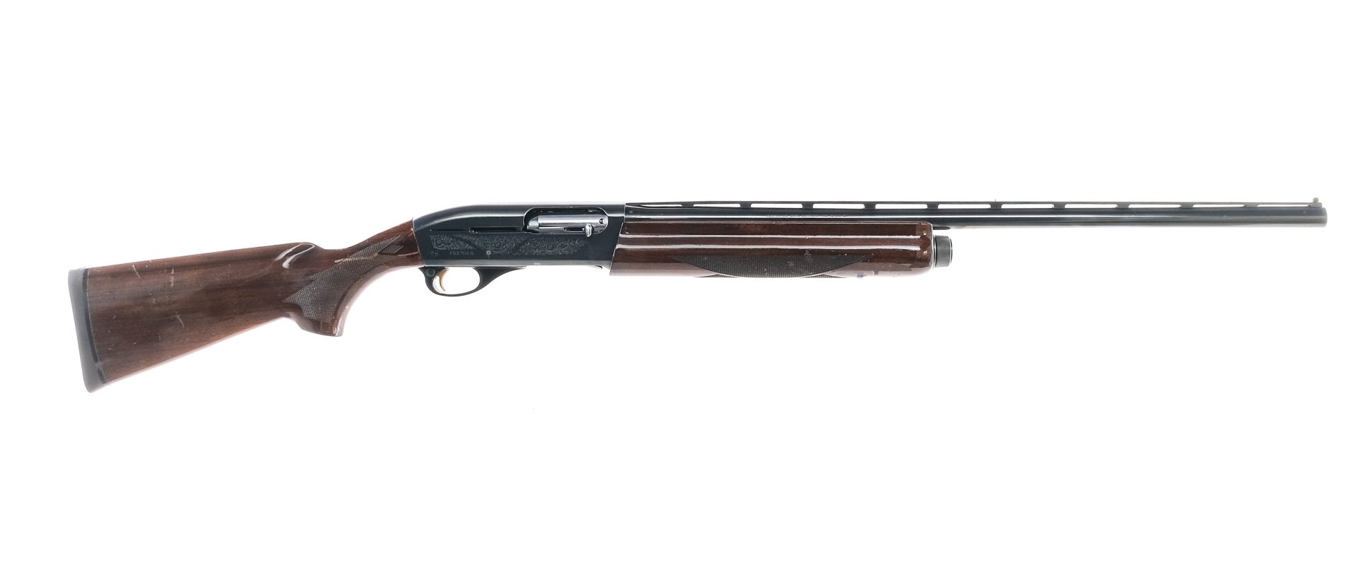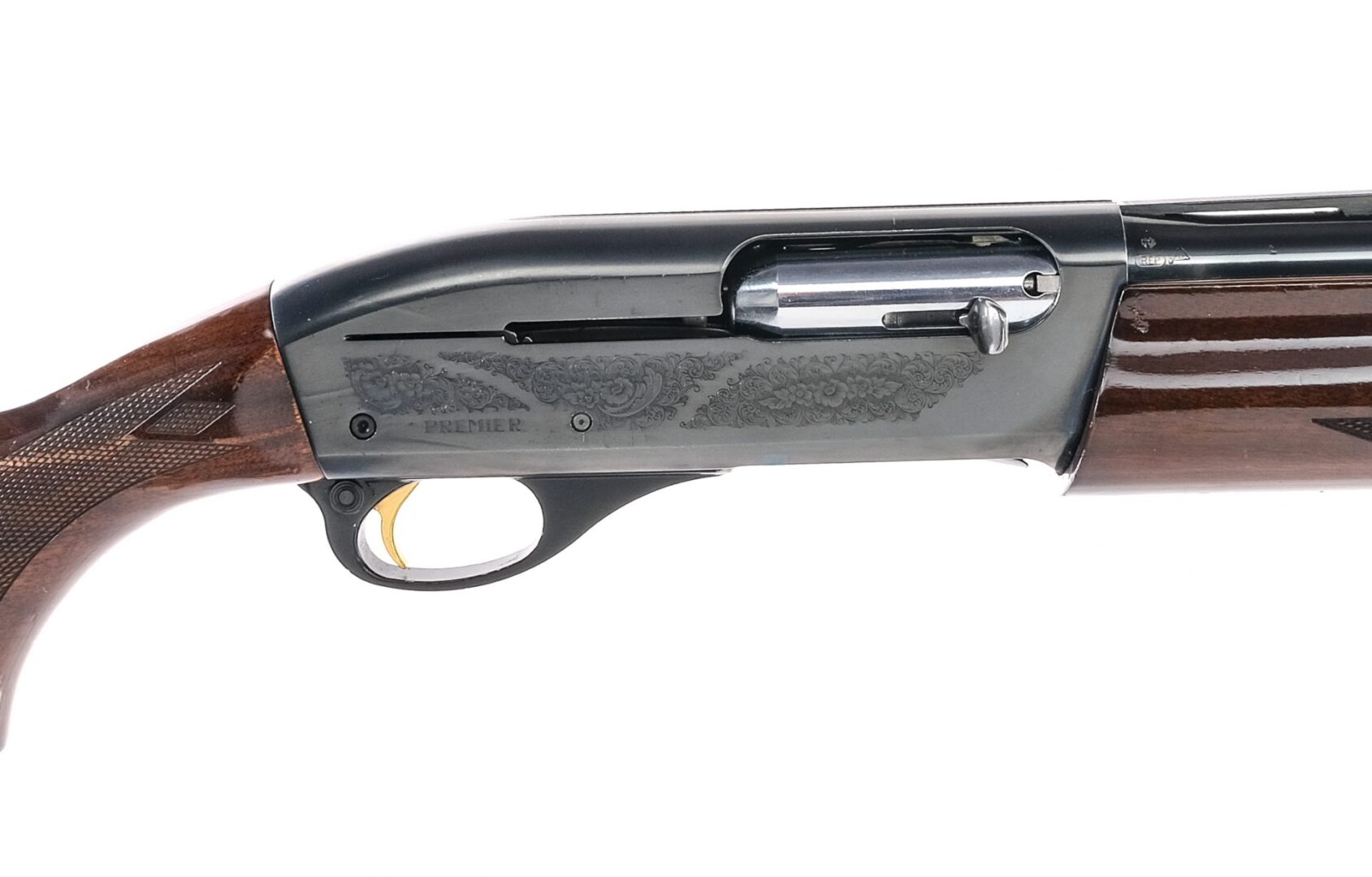 Description Remington 11-87 Premier chambered in 12 gauge for 2 3/4″ and 3″ shells with a 25.5″ light contour vented rib barrel with a Full screw in choke. Blued barrel, magazine tube, and receiver with floral engraving on both sides. Stainless bolt and loading gate bolt release. Gold plated trigger and black trigger guard with cross bolt safety selector. Diamond checkered wood forend and pistol grip stock with rubber butt pad. Dual bead sights. Must ship to FFL holder. Condition: Good/Very good with light scratches, contact marks, and handling wear on the finish. The wood has varying scratches, scuffs, and dings/contact marks on the varnish. Clean smooth bore. Barrel Length: 25.5″ Serial: PC639854 Manufacturer: REMINGTON ARMS COMPANY Gauge: 12 Ga. Model: 11-87 Premier Engraved Book# 00942