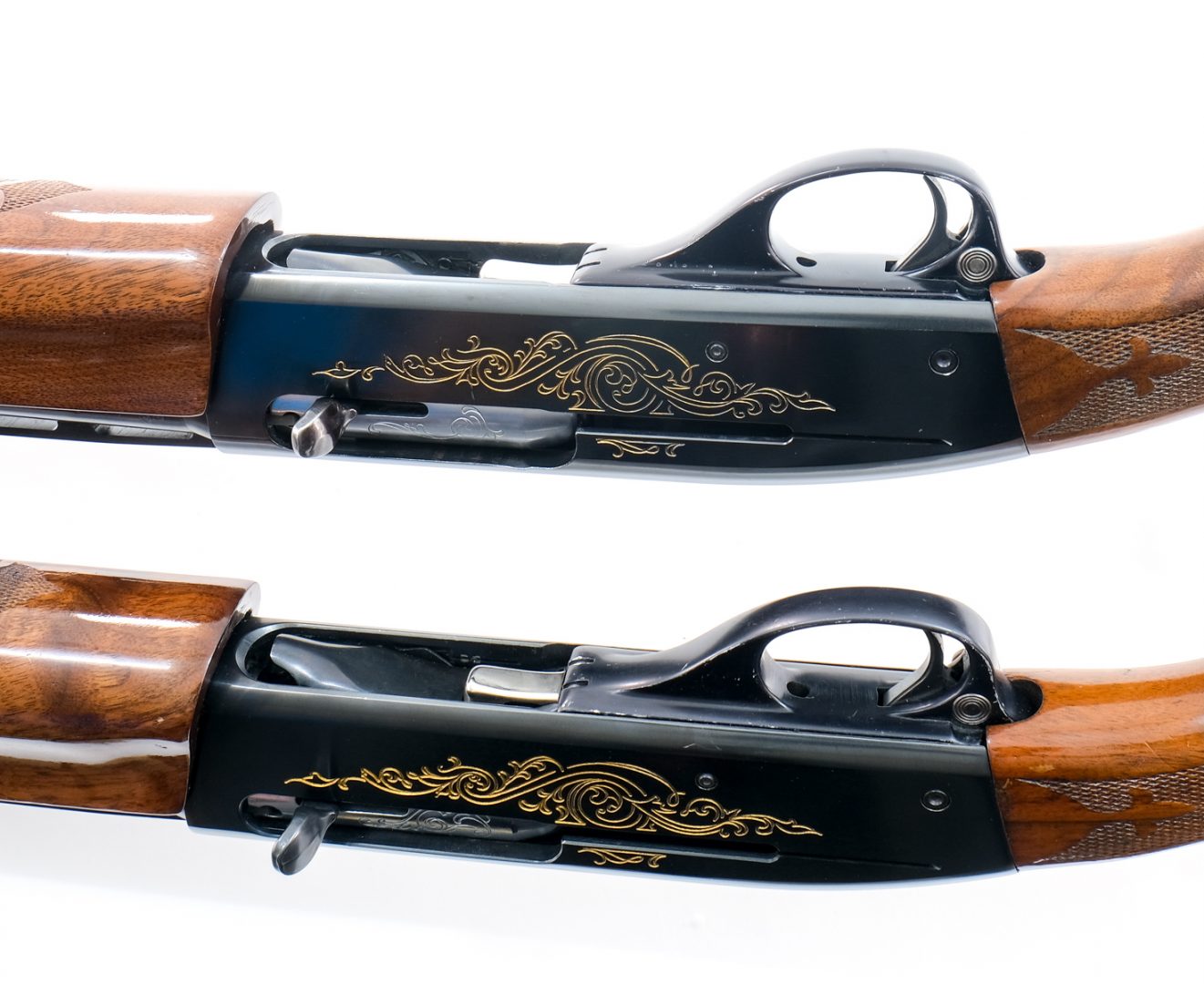 Description Remington 1100 and 1100LW two gun set. The first is a 1100 in 28 gauge 2 3/4″ barrel marked SKEET. Pachmayr White Line rubber recoil pad. Checkered wood stock and front foregrip. Factory engraved blued receiver, trigger, guard and top rib vented barrel. Right side of receiver located charging handle. Guard located push button safety. Mid- barrel metal bead and front white bead fixed sight. Comes with a single shell steel extension on the magazine tube for five rounds plus one in the chamber. Marked on the left side of receiver: Matched Pair No. 93. The second is a Model 1100LW in .410 gauge 2 1/2″ plastic shells only with a five round capacity with a 25″ CYL choke SKEET marked barrel. Pachmayr White Line rubber recoil pad. Checkered wood stock and front foregrip. Factory engraved blued receiver, trigger, guard and top rib vented barrel. Right side of receiver located charging handle. Rear trigger guard located push button safety. Mid-barrel metal bead and front white bead fixed sight. A one shell brass extension is on the magazine tube. Marked on the left side of receiver: Matched Pair No. 93 Remington Model 1100LW. Provenance: The Estate of Joseph Callahan, Former chemist for Dupont/Remington. Must Ship to FFL or C&R holder
