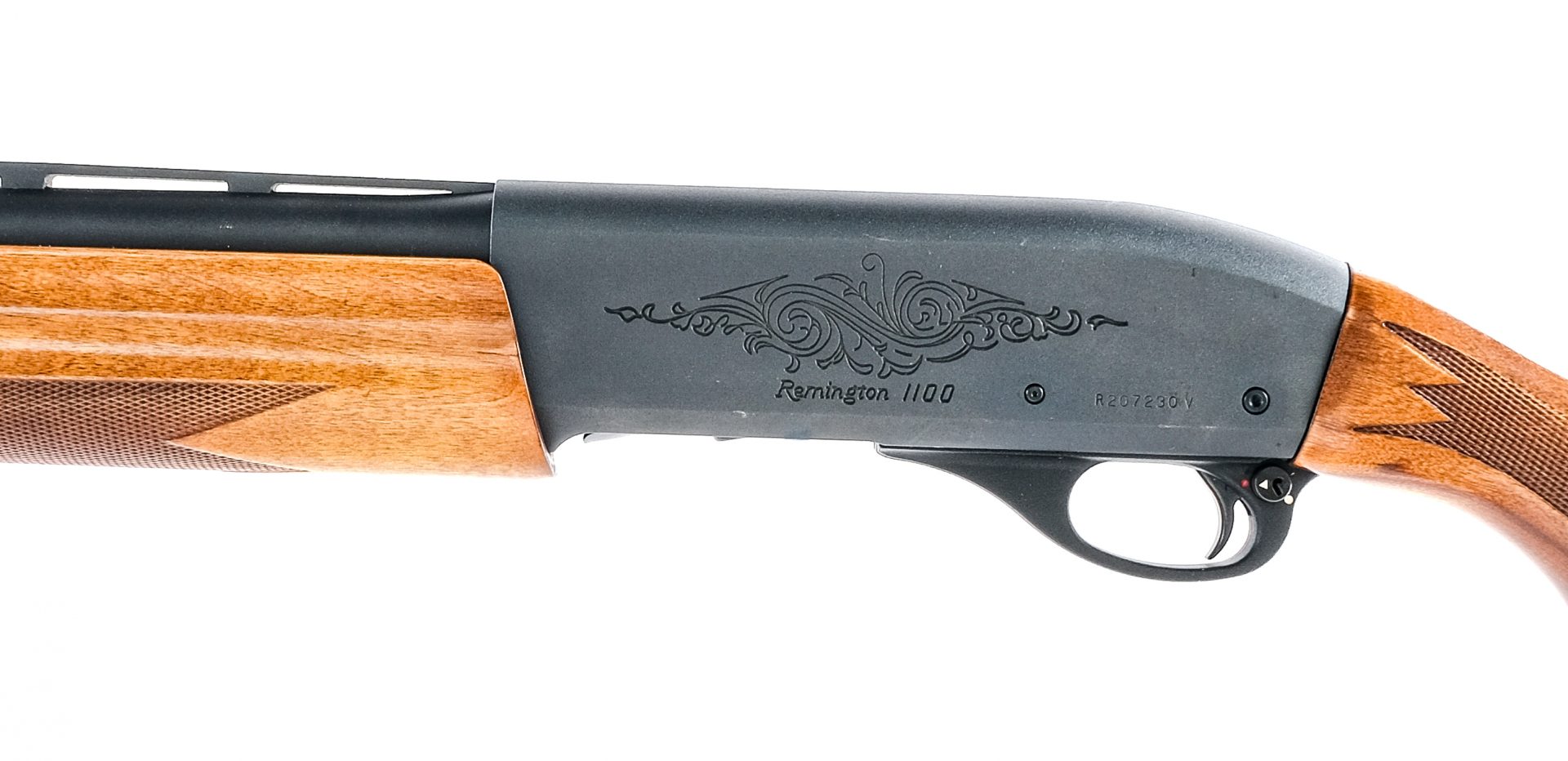 Description Remington Model 1100 in 12 Gauge 2 3/4″ with a four round capacity and a 28″ top rib vented barrel. Hand screw cylinder MOD choke. Stippled rubber butt plate. Checkered wood stock and front foregrip. Matte finished trigger guard, untextured trigger, receiver and barrel. Cross bolt safety selector. Right side of receiver charging handle. Rear bead sight. Sling mount eyelets on the magazine cap and under stock. Must ship to FFL holder. Condition: Excellent with various minor scratches throughout the receiver and barrel. Wood has minor scratching. A small part of the rib has rust on it. Smooth bore is extremely bright and clean. Barrel Length: 28″ Serial: R207230V Manufacturer: REMINGTON ARMS COMPANY Gauge: 12 Ga. Model: 1100 Book# 01841
