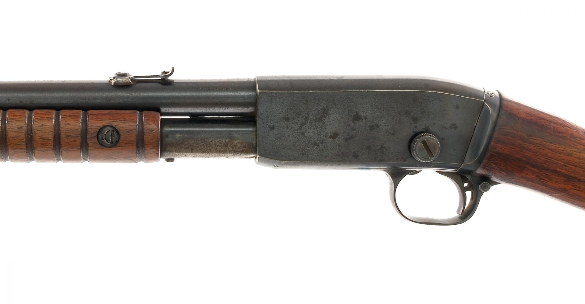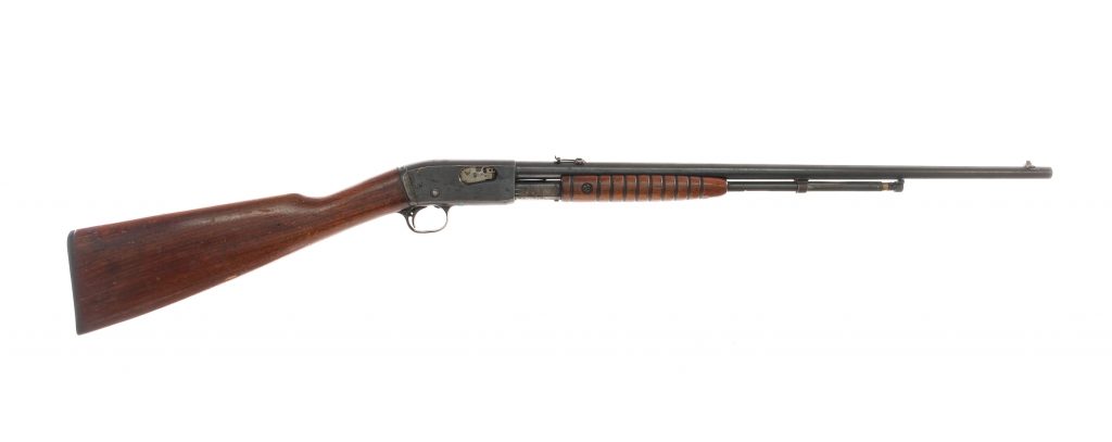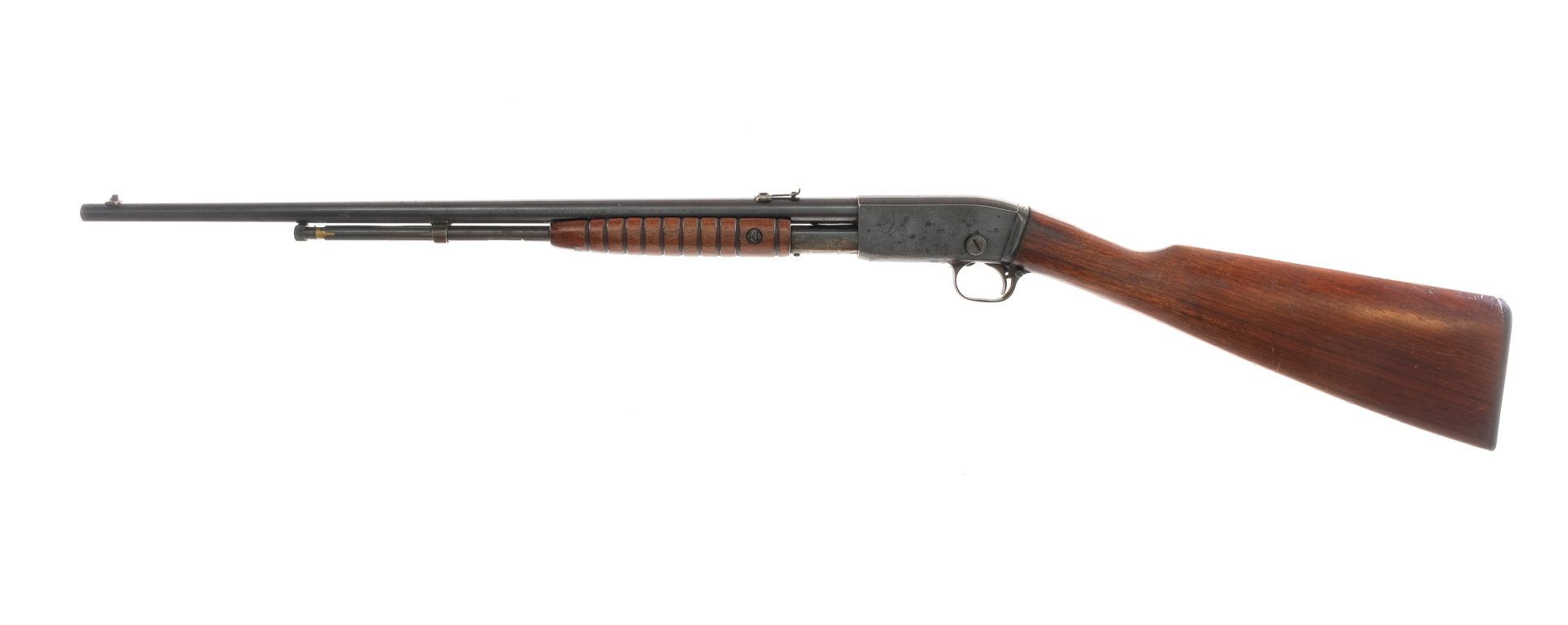 Description Remington 12A Takedown chambered in .22 short, long, and long rifle with a varied capacity magazine tube and a 22″ barrel. Blued barrel, magazine tube, receiver, and trigger. Cross bolt safety. Receiver mounted takedown screw. Ribbed wood forend and smooth straight stock with a checkered Remington UMC butt plate. Fixed iron sights. Must ship to a FFL or C&R holder. Condition: Good/Very Good with scratches and finish wear from normal handling, operation, and storage. Heavy finish patina and metal oxidation on the finish. Scratches scuffs, and dings in the wood. Worn butt plate. Most clean bore with strong rifling, shows a few small spots of metal oxidation/pitting. Barrel Length: 22″ Serial: 627502 Manufacturer: REMINGTON ARMS COMPANY Caliber: .22 Short, Long, Long Rifle Model: 12A Takedown Book# 02443