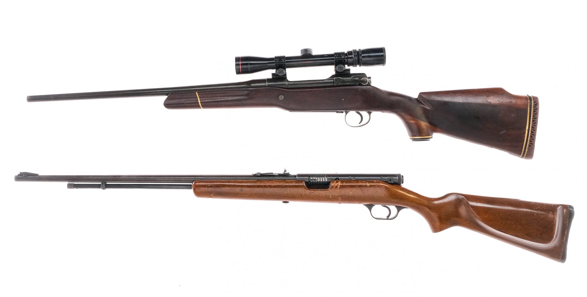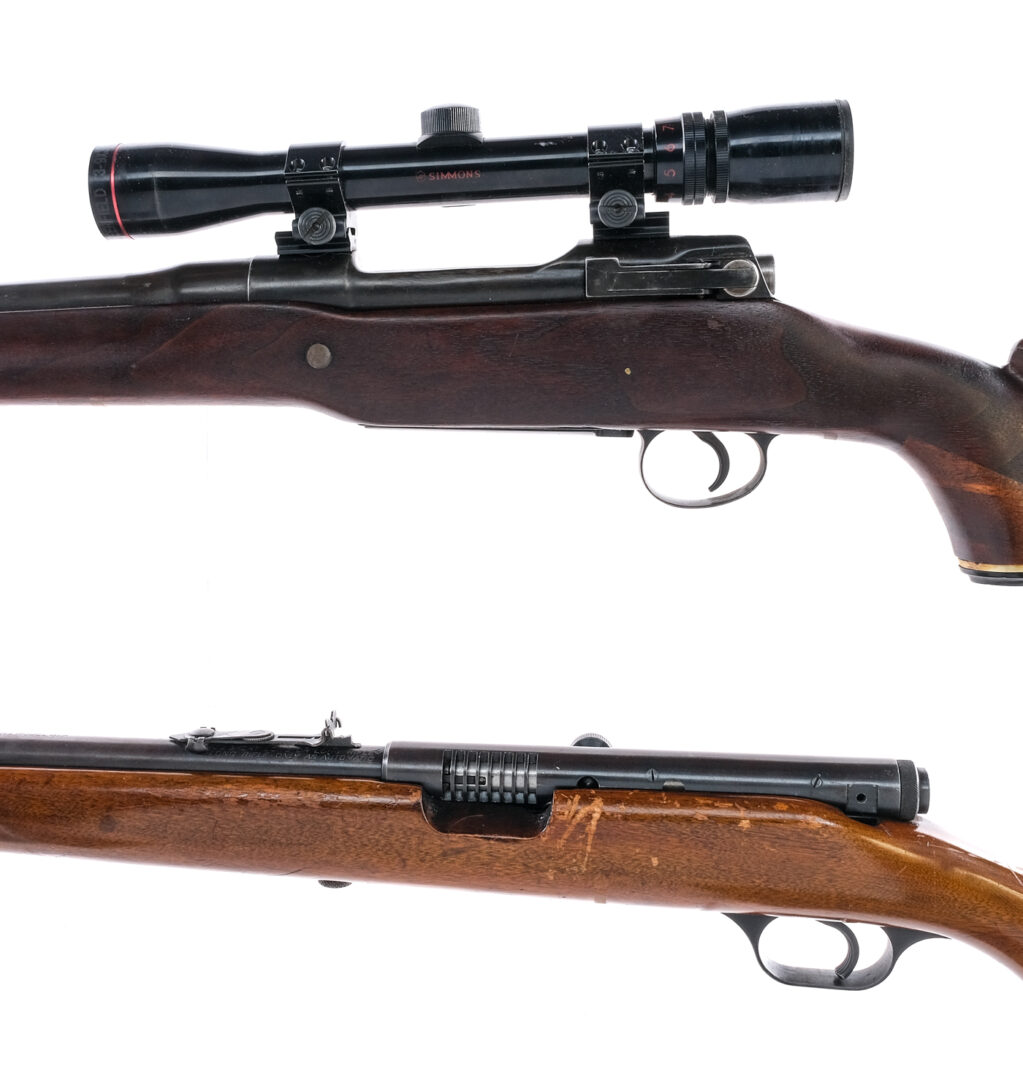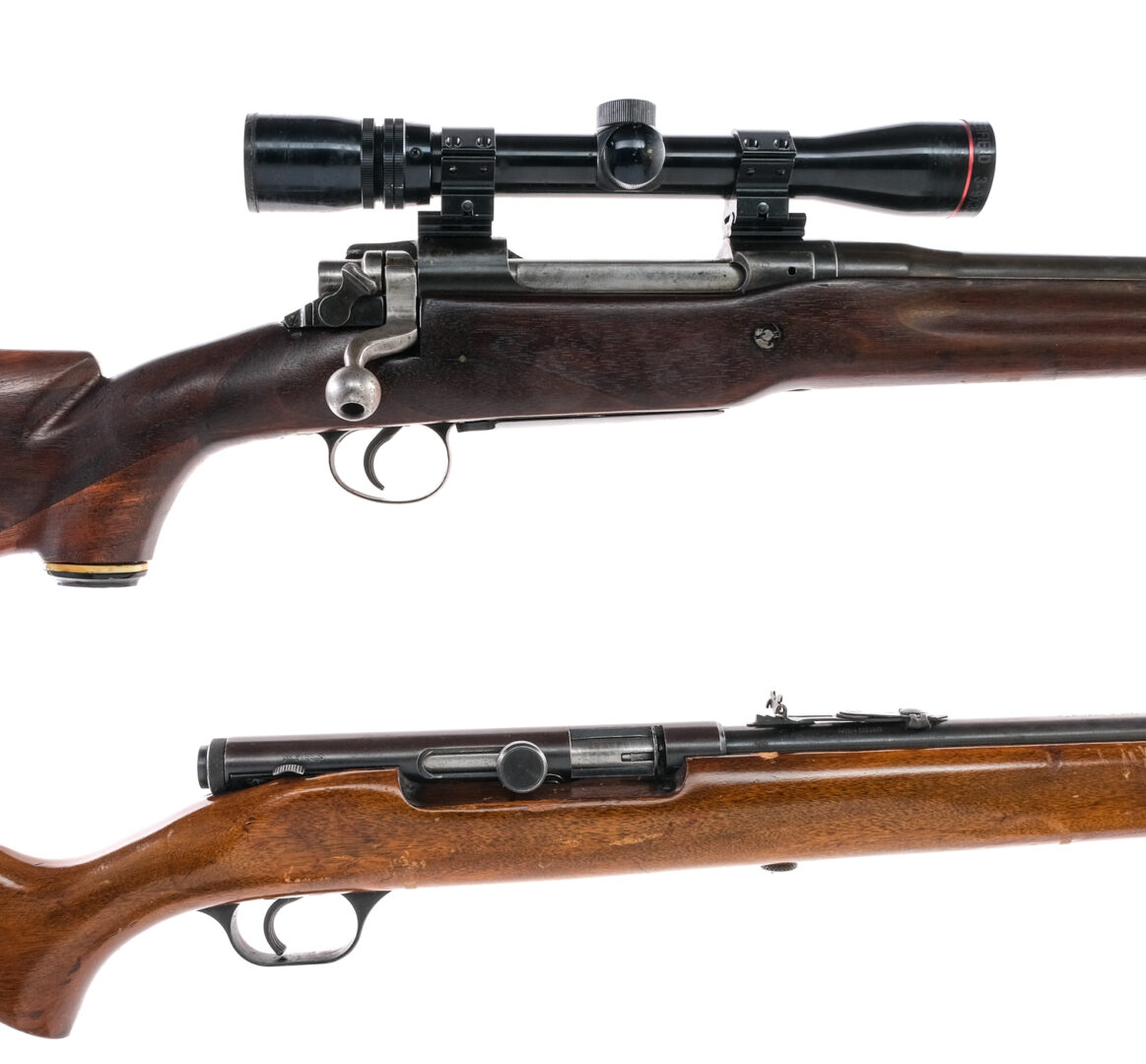 Description This lot is for two rifles, one J. Stevens and one Remington. J. Stevens/Springfield Model 87A in .22 Short, Long or Long Rifle with a varied capacity and a 24″ barrel. Monte Carlo style wood stock. Blued receiver, barrel and magazine tube. Rear adjustable and missing front fixed blade sight. U.S. Remington Model 1917 Enfield “Sporterized” in .30-06 with a six round capacity and a 20.5″ barrel. Modified original stock with added comb, toe and pistol grip. Blued serrated trigger, receiver and barrel. Mounted with a Simmons Deerfield scope 3-9×32 with clear glass and a duplex reticle. Must ship to a C&R or FFL holder. Condition: Fair with scratches, finish wear/loss, refinished Remington, modified wood on the Remington, scratches, touches of rust, J Stevens missing front sight and handling wear. The Remington has rust to the rifled bore with strong rifling. The J Stevens has a clean rifled bore. Sold AS-IS. Barrel Length: 20.5″ 24″ Serial: 618824 NVSN Manufacturer: J. Stevens Remington Year-Range 1917-1964 Book# 01084 01078