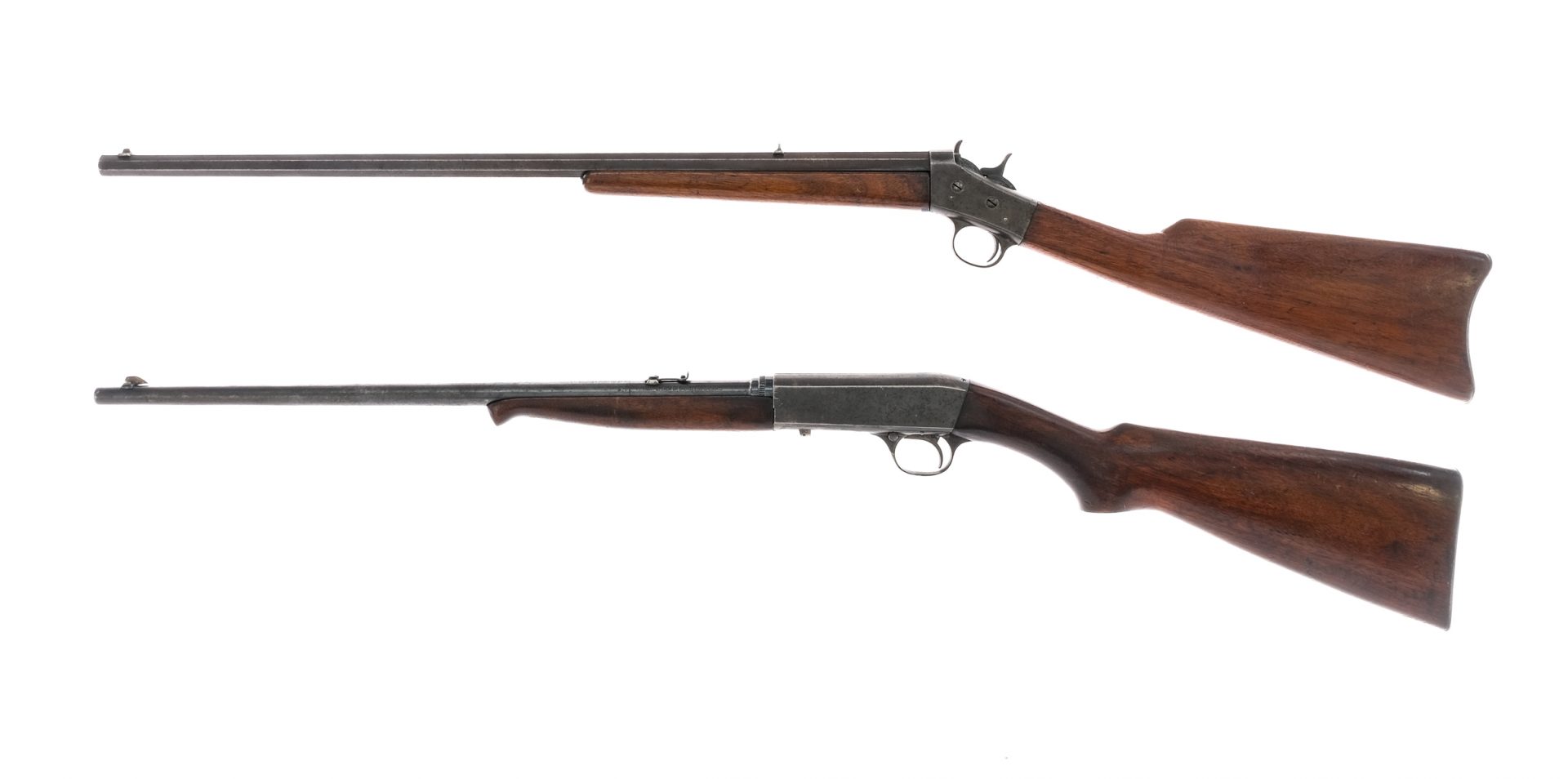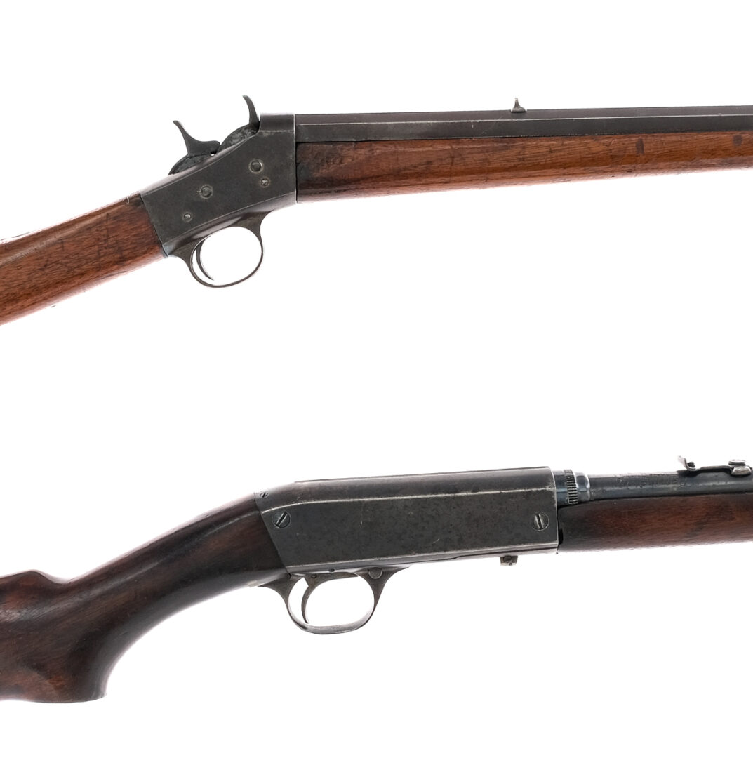 Description This lot is for two Remington rimfire rifles, The first is a Remington model 24 takedown semi auto rifle chambered in .22 short with a internal stock magazine tube and a 19″ barrel. Blued barrel and receiver. Cross bolt safety selector, serrated cocking handle and take down button. Smooth wood Schnabel forend and stock with metal butt plate. Fixed iron sights. The second rifle is a Remington #4 falling block single shot chambered in .32 rimfire with a 23.5″ octagonal barrel. Blued finish with smooth wood forend and stock with metal butt plate. Fixed iron sights. Must ship to FFL or C&R holder. Condition: Poor, both rifles show varying scratches, finish wear/loss, metal oxidation, and patina. Scratches, scuffs, and dings in the wood. Both have poor bores with bulged barrels. SOLD AS-IS. Barrel Length: 19″ 23.5″ Serial: 10471 55366 Manufacturer: REMINGTON ARMS COMPANY Caliber: .22 Short, .32 RF Model: 24, #4 Rolling Blok Book# 01556 01581