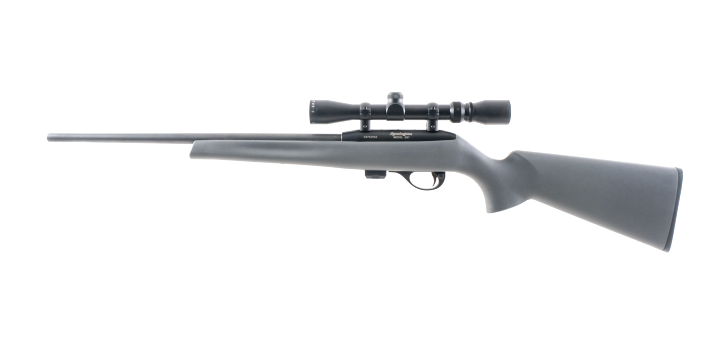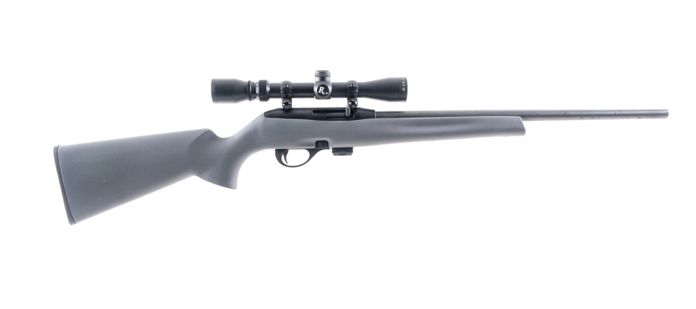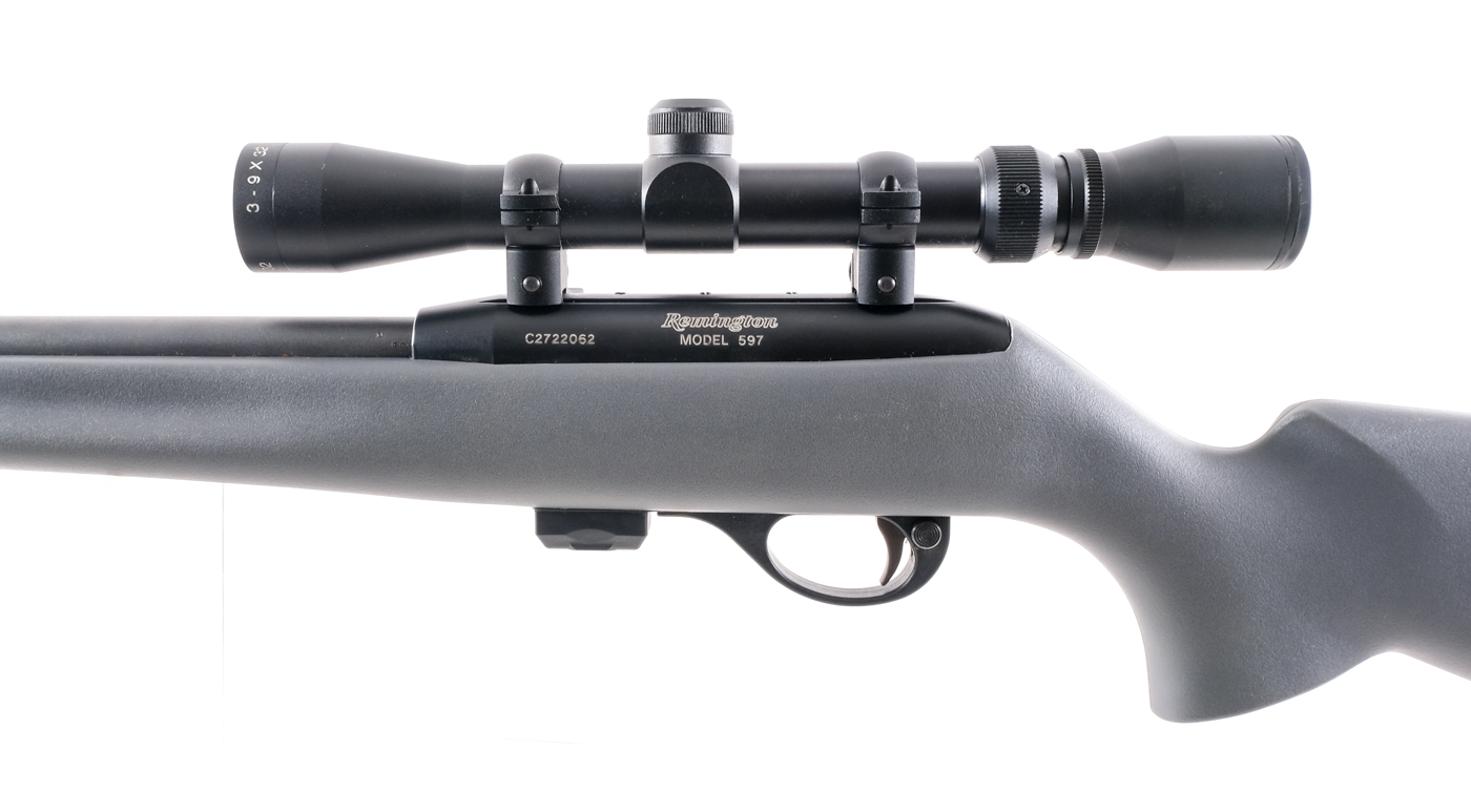 Description Remington Model 597 in .22 Long Rifle with one, ten round removable magazine and a 20″ barrel. Checkered composite butt plate. Textured gray composite stock. Black composite trigger guard. Blued untextured trigger, receiver and barrel. Rear trigger guard located push button safety. Right side charging handle and serrated magazine release. No fixed sights, mounted with a Remington 3-9×32 scope with clear glass and a duplex reticle. Comes in its factory box with matching serial number, gun lock and instruction manual. Must ship to a FFL. Condition: Good with light scuffs and surface rust on the barrel. Clean rifled bore. Barrel Length: 20″ Serial: C2722062 Manufacturer: Remington Caliber: .22 LR Model: 597 Book# 8-882