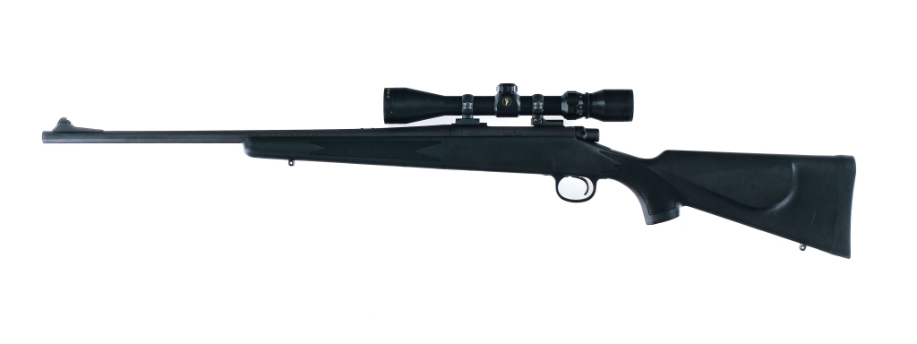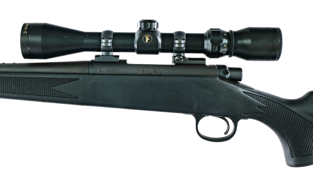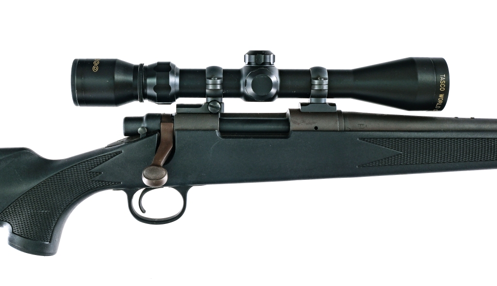 Description Remington Model 700 in .243 Winchester with a four round capacity and a 22″ barrel. Rubber butt plate. Checkered Monte Carlo style composite stock and front forend. Blued trigger guard, serrated trigger, receiver, bolt and barrel. Rear right side of receiver safety switch. Rear barrel drilled and tapped for fixed sights. Mounted with a Tasco 3-9×40 scope with clear glass and a duplex reticle. Must ship to a FFL holder. Condition: Very Good with light scuffs and touches of rust. Clean rifled bore. Barrel Length: 22″ Serial: E6792560 Manufacturer: Remington Caliber: .243 Win Model: 700 Book# 08390