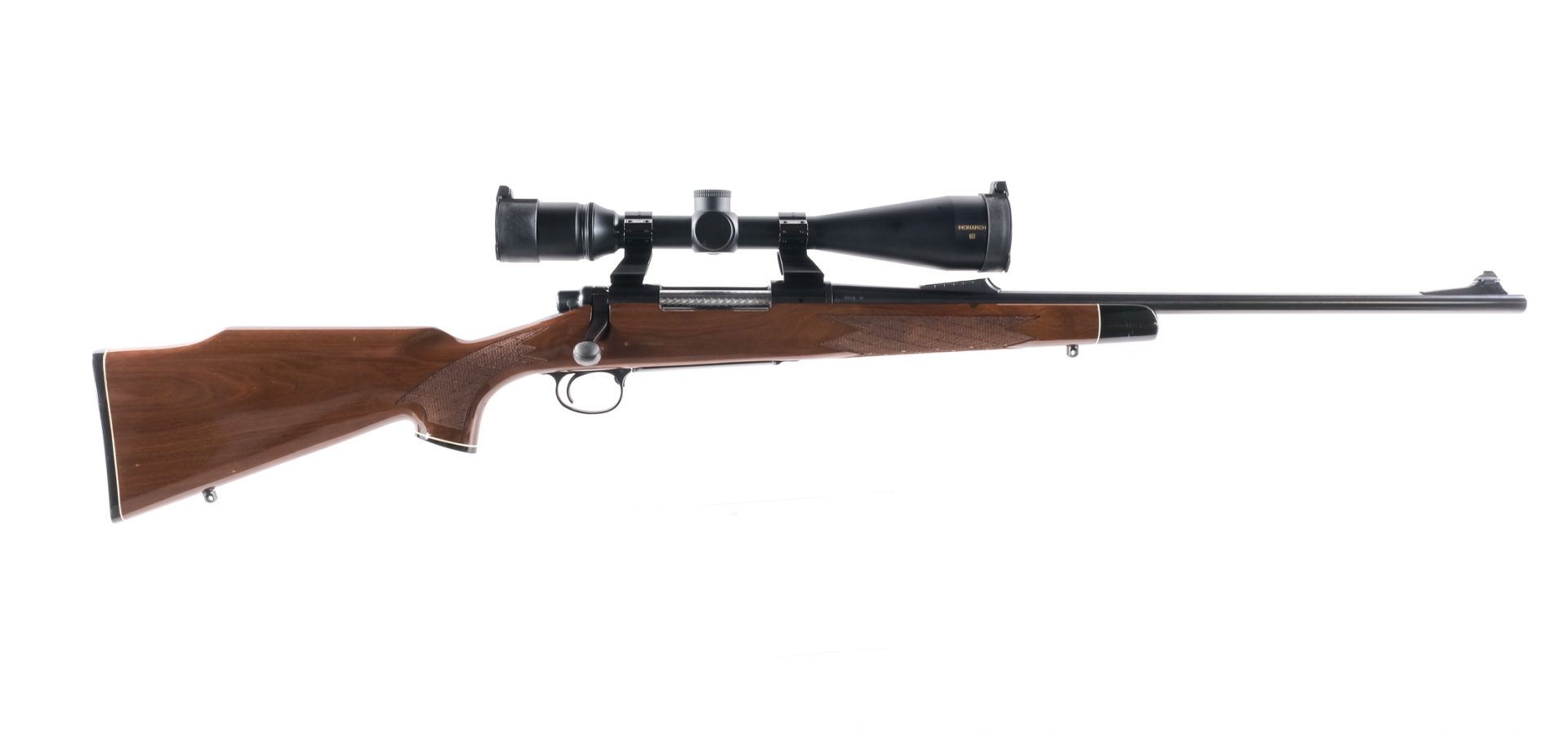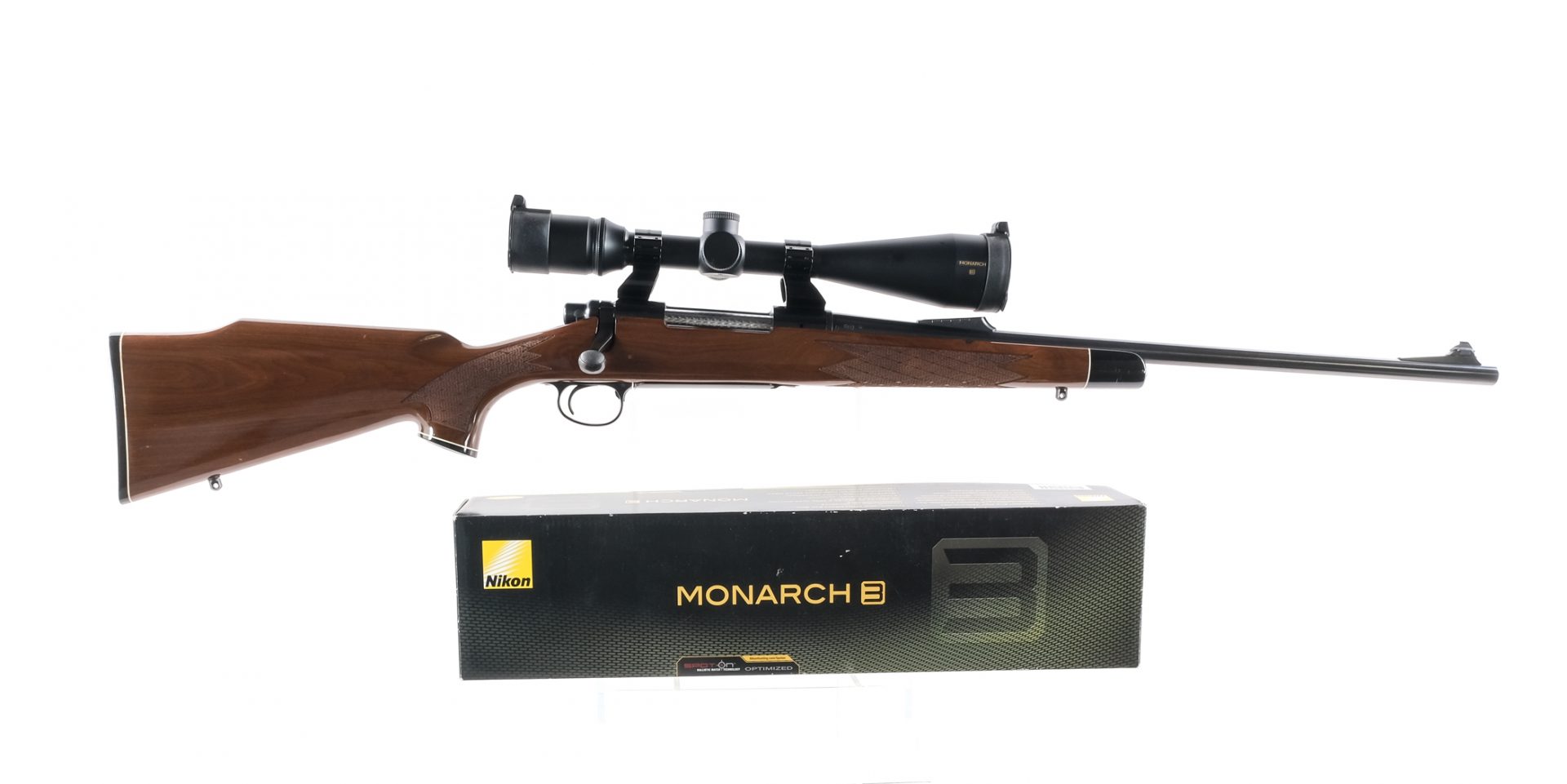 Description Remington 700 in .30-06 Springfield with a four round capacity and a 22″ barrel. Checkered black composite butt plate. Checkered Monte Carlo style stock and front forend. Blued trigger guard, serrated trigger, receiver, checkered bolt handle and barrel. Jeweled bolt body. Rear right side of receiver serrated safety switch. Front fixed blade sight, mid barrel sigh has been partially removed. Metal eyelet studs for mounting a shoulder sling. Mounted with a Nikon Monarch MR31 4-16×50 scope with clear glass, lens covers and a duplex reticle. Comes with instruction manual and the rear sight piece. Must ship to a FFL holder. Condition: Very Good/Excellent with light scuffs and handling wear. Clean rifled bore. Barrel Length: 22″ Serial: C6375067 Manufacturer: Remington Caliber: .30-06 Sprg Model: 700 Book# 9-055