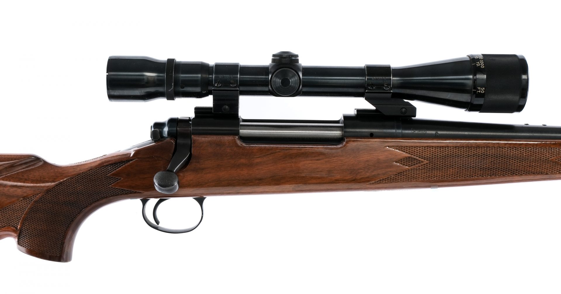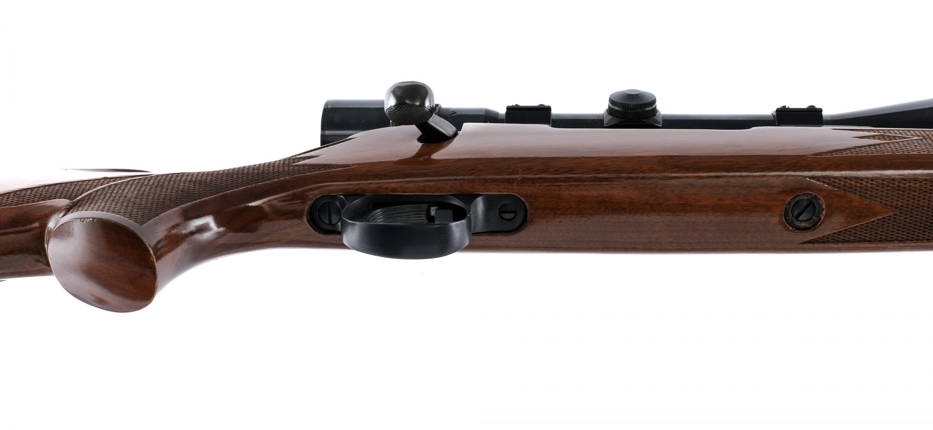 Description Remington Model 700 in .30-06 Springfield with a five round capacity and a 22″ barrel. Made in Ilion New York. Checkered metal butt plate. Checkered Monte Carlo style stock and front forend. Blued trigger guard, serrated trigger, receiver, bolt handle and barrel. Rear right side of receiver safety switch. Mid barrel and front muzzle end drilled and tapped for sights. Receiver mounted with a Weaver V9 3-9×40 scope with clear glass and a duplex reticle. Metal eyelets for mounting a shoulder sling. Must ship to a FFL holder. Condition: Good/Very Good with light wood scratches, handling wear and a touch of rust on the safety switch. Clean rifled bore. Barrel Length: 22″ Serial: 245593 Manufacturer: Remington Year: 1977 Caliber: .30-06 Sprg Model: 700 Book# 05977