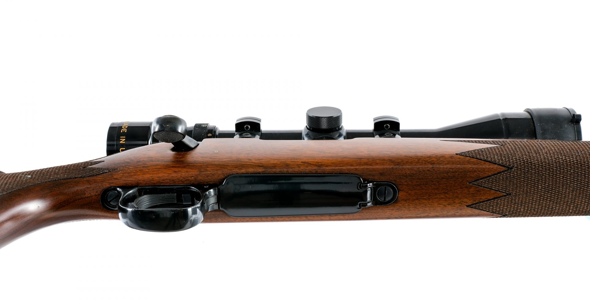 Description Remington Model 700 in .300 Savage with a four round capacity and a 24″ barrel. Rubber butt pad. Checkered wood stock and front forend. Black finished trigger guard and magazine floor plate. Blued serrated trigger, bolt handle, receiver and barrel. Jeweled bolt body. Rear right side of receiver safety switch. No fixed sights, mounted with a Redfield 3x-9x scope with clear glass and a duplex reticle. Metal eyelets for mounting a shoulder sling. Must ship to a FFL holder. Condition: Very Good/Excellent with light scuffs, wood dings and handling wear. Clean rifled bore. Barrel Length: 24″ Serial: G6333105 Manufacturer: Remington Year: 2003 Caliber: .300 Savage Model: 700 Book# 05076