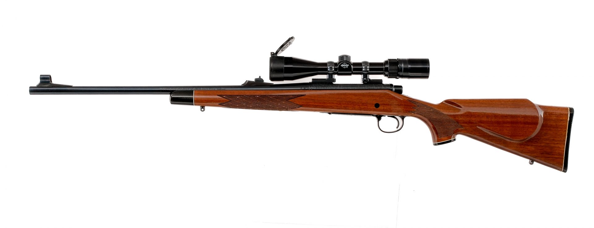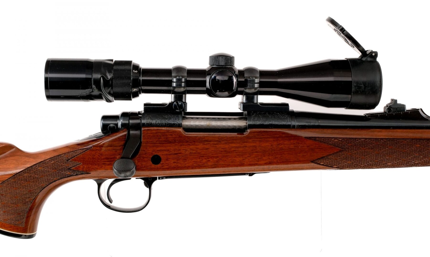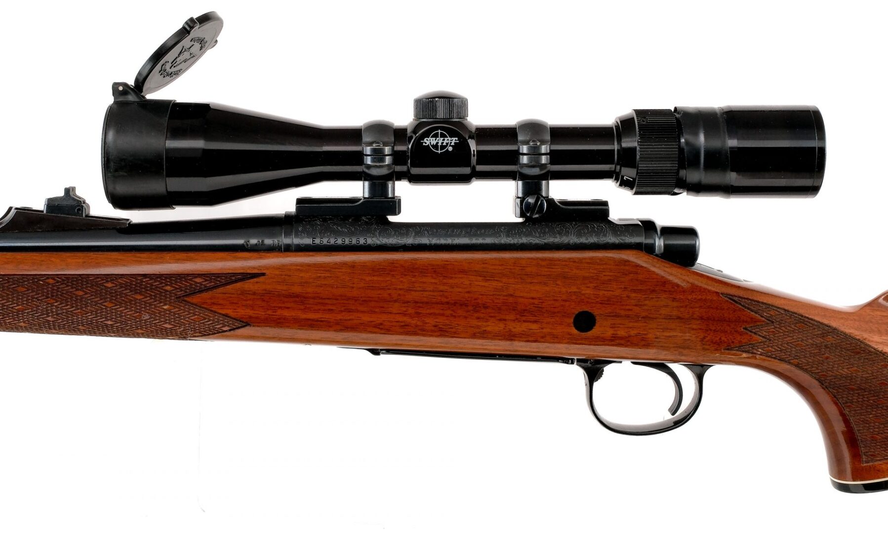 Description UPDATE: Not a C&R Rifle, this one made after 1980. Remington 700 Deluxe Engraved chambered in .243 Winchester with a internal magazine and a 22″ barrel. Manufactured in 1954 with AA date code. Blued barrel, receiver, floor plate, and trigger. Scroll engraved receiver and scroll engraved floor plate with Ram engraving. Jeweled bolt body and blued bolt handle. Push to fire bolt safety. Drilled and tapped receiver with mounted 2-7×10 wide angle Swift scope. Wood Monte Carlo stock with checkered forend, checkered pistol grip, and butt plate. Front and rear sling eyelets. Must ship to a FFL or C&R holder. Condition: Very good with some scratches and wear on the finish from normal handling/operation. Some spots of metal oxidation on the front sight hood and sling eyelets. Some light scratches, scuffs, and dings on the stock. Bright and clean bore with strong rifling. Barrel Length: 22″ Serial: E6429963 Manufacturer: REMINGTON ARMS COMPANY Year: 1954 Caliber: .243 Winchester Model: 700 Deluxe Engraved Book# 04602