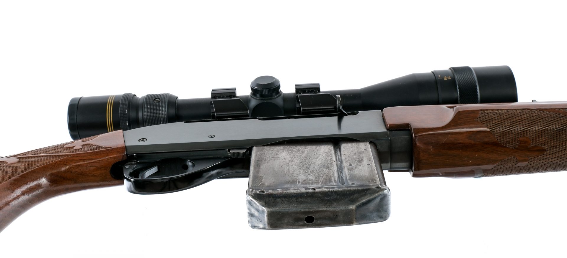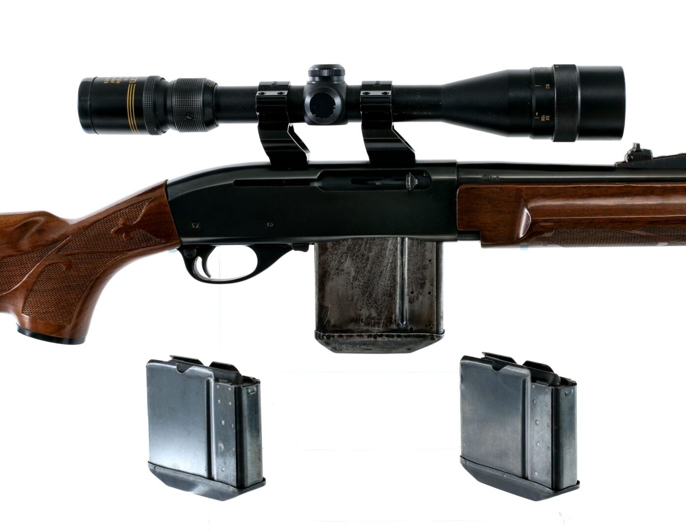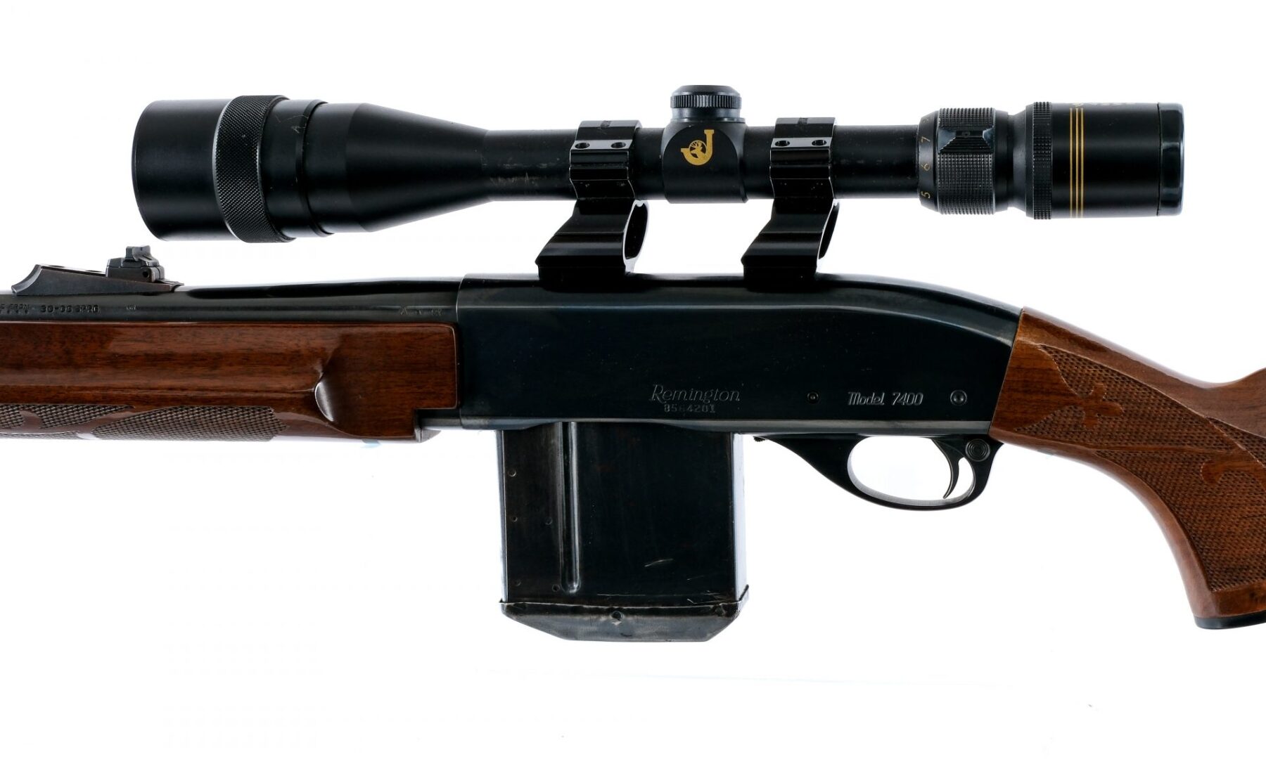 Description Remington 7400 chambered in .30-06 Springfield with three magazines and a 22″ barrel. Two of the magazines are ten rounds and the third is fifteen rounds. Blued barrel, receiver, charging handle, and trigger. Cross bolt safety and serrated magazine release. The receiver is drilled and taped and mounted with a Jason 4-12×40 Wide Angle Waterproof scope. Adjustable rear and fixed front blade iron sights. Checkered wood forend and pistol grip stock with rubber butt pad. Front and rear sling eyelets. Must ship to a FFL holder. Check local laws regarding “High Capacity” magazines BEFORE bidding. Condition: Good/Very Good with light scratches, contact marks, and general cosmetic handling wear. Small specks of metal oxidation on the sling swivels. Light scratches and dings on the wood. The bore is bright and mostly clean with a few light spots of metal oxidation. The rifling is strong. The scopes glass is clear and intact. Barrel Length: 22″ Serial: 8564201 Manufacturer: REMINGTON ARMS COMPANY Caliber: .30-06 Springfield Model: 7400 Book# 05420
