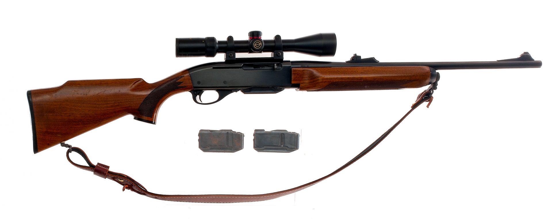 Description Remington 7400 Carbine in .30-06 Springfield with three, five round removable magazines and a 19″ barrel. Checkered composite butt plate. Checkered wood stock and front forend. Blued trigger guard, trigger, receiver and barrel. Rear trigger guard push button safety. Front trigger guard magazine release. Rear adjustable and front fixed blade sight. Mounted with a Simmons ProSport 3-9×40 scope with clear glass and a duplex reticle. Comes with a Bandera USA leather shoulder sling. Must ship to a FFL holder. Condition: Very Good with small scratches and handling wear. Clean rifled bore. Barrel Length: 19″ Serial: B8241174 Manufacturer: Remington Caliber: .30-06 Sprg Model: 7400 Carbine Year-Range 1988-2004 Book# 03372