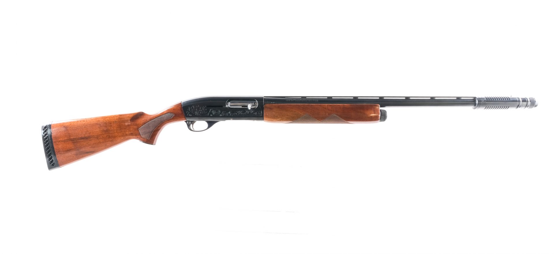 Description Remington 878 Automaster in 12 gauge with a two round capacity and a 21.5″ top rib vented barrel. Muzzle mounted Cutts Compensator with adjustable choke. Simmons Gun Specialties Inc marked top rib. Textured rubber butt plate. Checkered wood stock and front foregrip. Blued trigger guard, receiver and top rib vented barrel. Rear trigger guard push button safety. Right side of receiver unfinished charging handle. Front fixed metal bead sight. Must ship to a C&R or FFL holder. Condition: Good/Very Good with scuffs, wood dings and handling wear. Clean smooth bore. Barrel Length: 21.5″ Serial: 58183L Manufacturer: Remington Gauge: 12 Model: 878 Year-Range 1959-1963 Book# 9-679