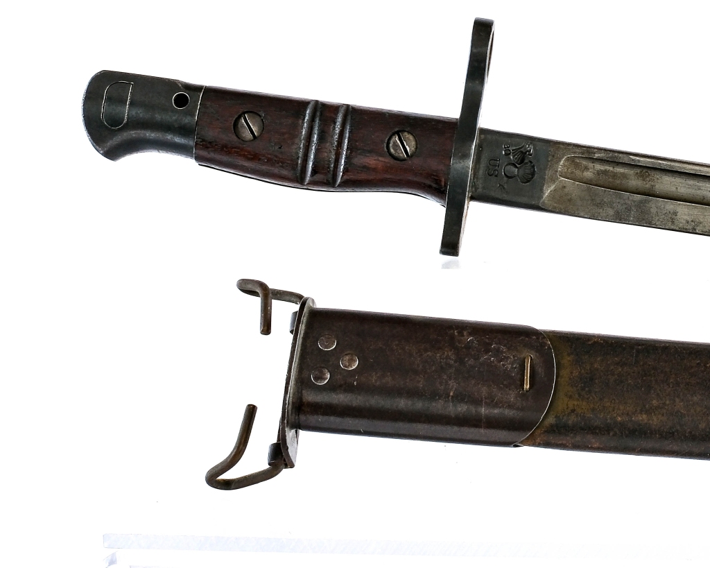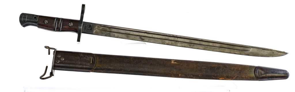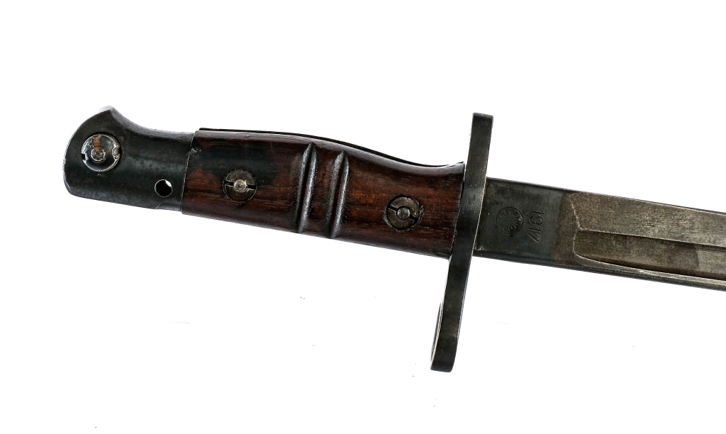 Description Remington M1917 Enfield chambered in .30-06 Springfield with a six-round internal magazine and a 26″ barrel. Manufactured in 1918 with serial number 407775. The barrel is also dated to 5-1918 with R over flaming bomb proof. Front bayonet light. Adjsutable rear sight and protected front blade. Rear push to fire safety. Parkerized finish with smooth wood stock and top forends. Metal butt plate. Front and rear sling swivels with mounted sling. Flaming Bomb proof on the bolt handle and side of the receiver. Comes with a M1917 bayonet with scabbard. The right side of the ricasso is marked with “US”, Flaming Bomb proof, and Eagle over 30. The left side has “Remington” inside a circle and “1917”. The scabbard mounts are marked with “GF”. Must ship to a FFL or C&R holder. Condition: Good/Very good with light scratches, sharp edge wear, and general cosmetic handling wear. Some spots of finish patina and finish thinning. Some light spots of metal oxidation. The wood has been sanded and refinished. Light scratches and dings on the wood. Decently bright bore with some spots of metal oxidation. Strong visible rifling. Barrel Length: 26″ Serial: 407775 Manufacturer: REMINGTON ARMS COMPANY Caliber: .30-06 Springfield Model: M1917 Enfield Book# 07762