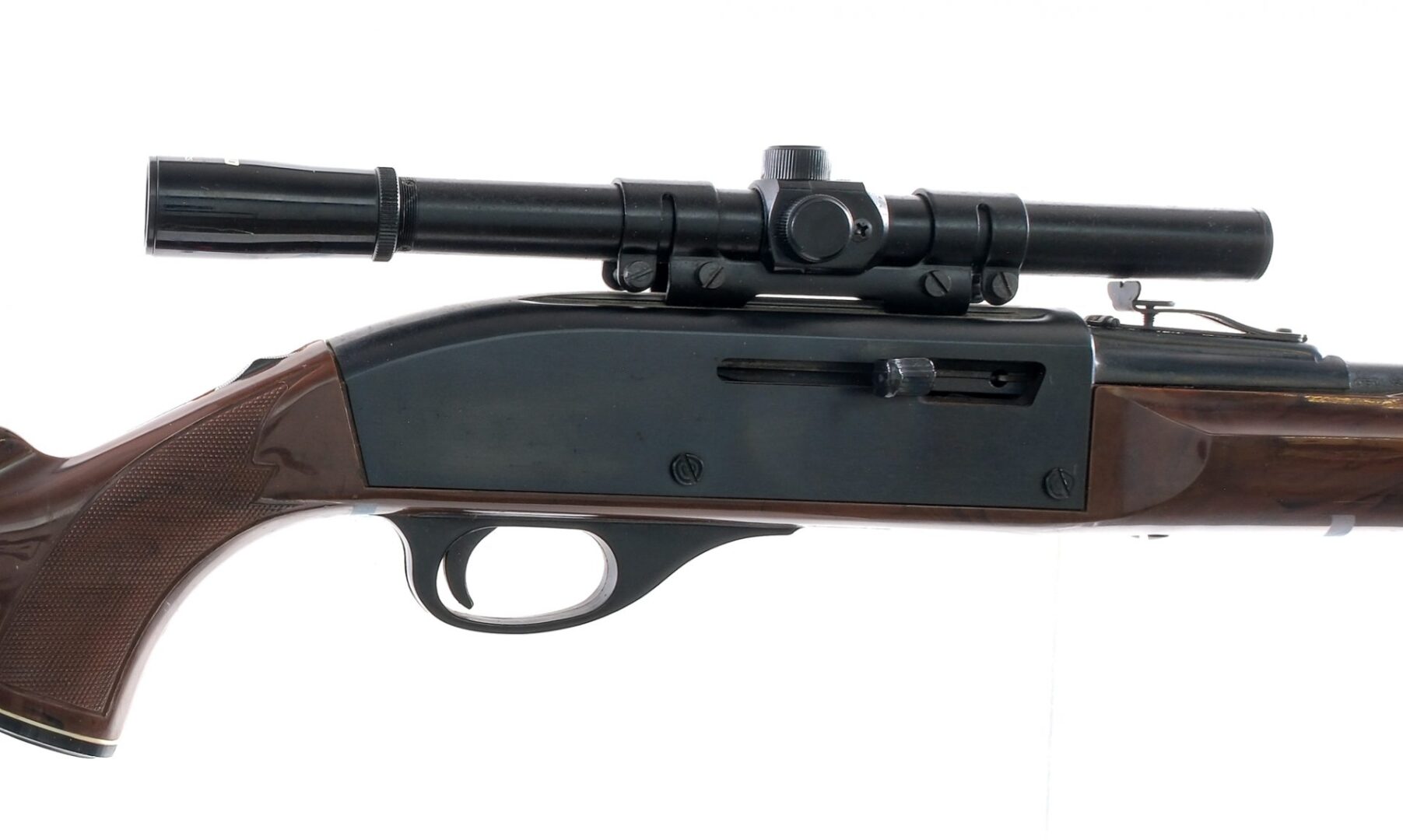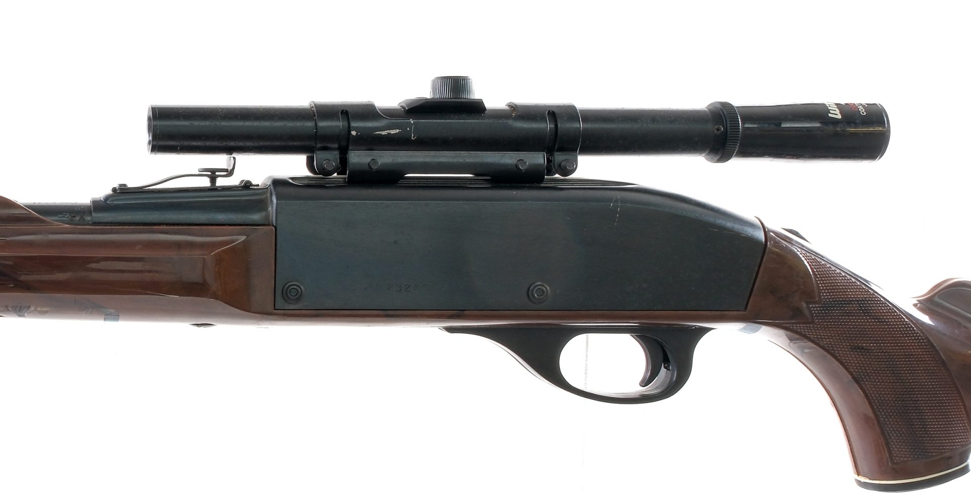 Description Remington Nylon 66 chambered in .22 long rifle with a fourteen round tube magazine and a 19.5″ barrel. Blued barrel and receiver. Serrated charging handle and trigger. Tang mounted safety. The receiver is grooved and mounted with a period correct Winfield 4×15 scope. Nylon stock with checkered forend, pistol grip, and ribbed Remington butt plate. Adjustable rear sight and fixed front shark fin blade. Must ship to a FFL or C&R holder. Condition: Good/Very Good with some scratches and wear from normal handling and operation. Light speckling of metal oxidation on the barrel and receiver. Clean rifled bore. Barrel Length: 19.5″ Serial: 2328375 Manufacturer: REMINGTON ARMS COMPANY Caliber: .22 Long Rifle Model: Nylon 66 Book# 01917
