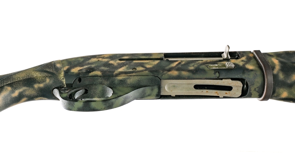 Description Remington Model SP-10 Magnum in 10 gauge Magnum 3 1/2″ with a two round capacity and a 23″ top rib vented barrel. Bore has removable Remington Turkey Extra FULL choke. Rubber butt pad. Checkered wood camouflaged stock and front forend. Camo composite trigger guard. Camo finished receiver. Rear trigger guard push button safety. Right side of receiver charging handle and action release. Mid barrel metal bead and front fixed white bead sight. Must ship to a FFL holder. Condition: Good with refinished parts in aftermarket camouflage and light spots of rust. Clean smooth bore. Barrel Length: 23″ Serial: RM021042 Manufacturer: Remington Gauge: 10 Model: SP-10 Magnum Book# 08321