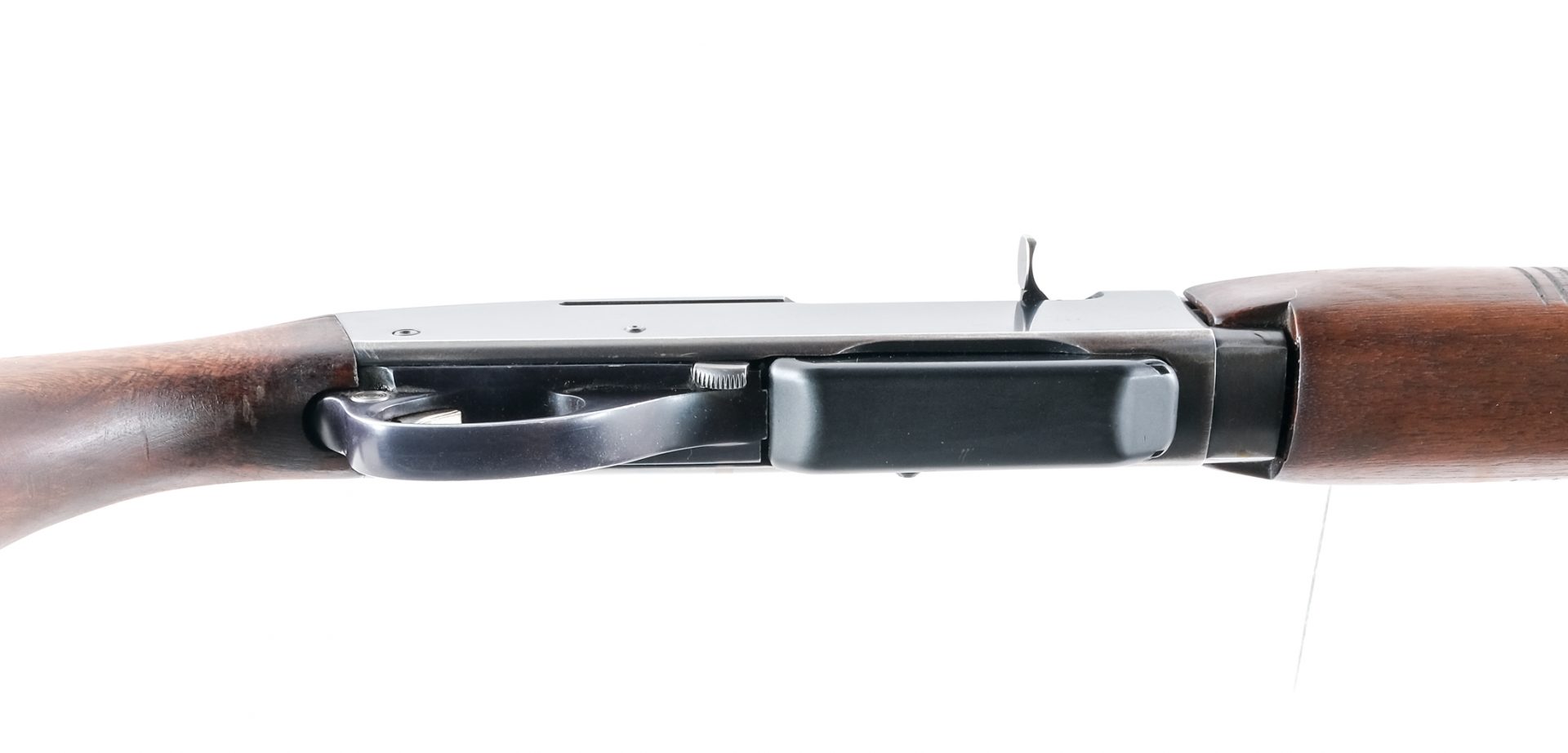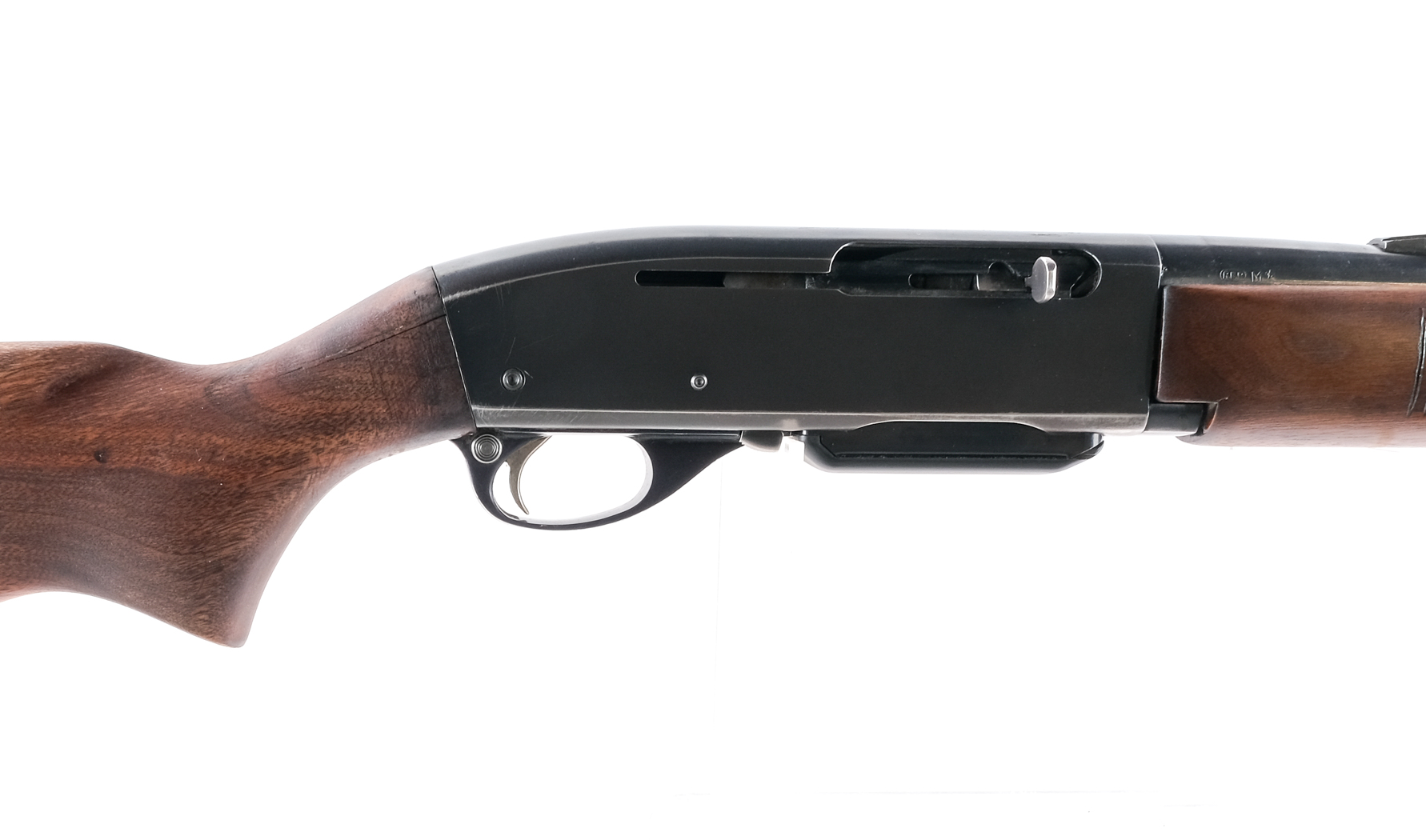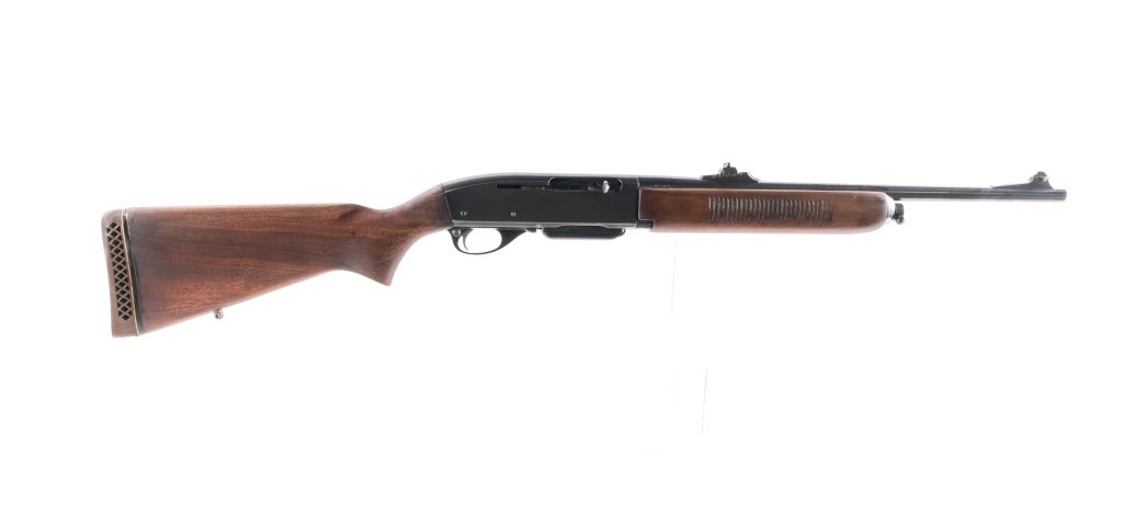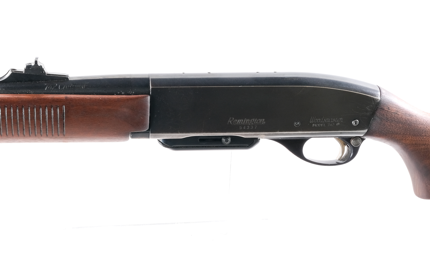 Description Remington Woodsmaster 742 Carbine in .30-06 Springfield with one, four round removable magazine and a 19″ barrel. Pachmayr rubber butt pad. Smooth wood stock and front serrated foregrip. Blued trigger guard, untextured trigger, receiver, and barrel. Rear trigger guard located push button safety. Rear adjustable and front fixed blade sight. Metal eyelet studs to mount a shoulder sling. Top receiver is drilled an tapped for mounting optics. Must ship to a C&R or FFL holder. Condition: Good with cracks in the stock where it meets the receiver, scratches, touches of rust and finish wear. Clean rifled bore. Barrel Length: 19″ Serial: 54337 Manufacturer: Remington Year: 1961 Caliber: .30-06 Sprg Model: 742 Woodsmaster Carbine Book# 9-675