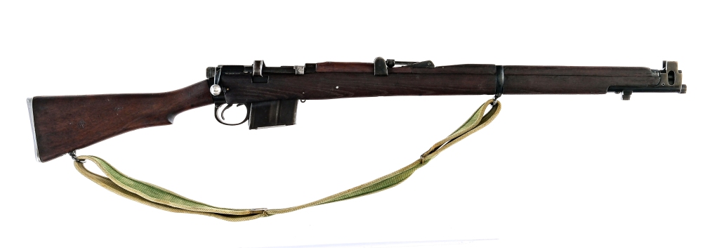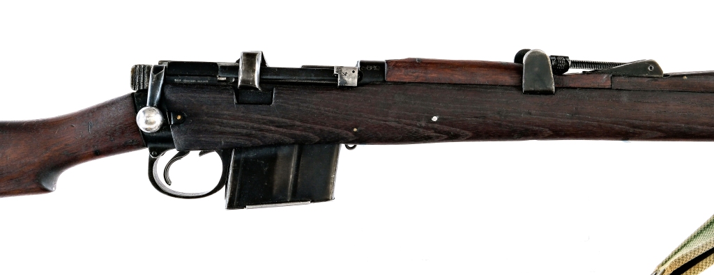 Description Rifle Factory Ishapore Model 2A/2A1 in 7.62x51mm with one, ten round removable magazine and a 25″ barrel. Rear right side of receiver has import mark: NAC Ridgefield NJ. Metal butt plate with cleaning kit door, empty. Smooth wood stock and front forend. Blued trigger guard, serrated trigger, receiver, bolt and barrel. Inside trigger guard magazine release. Rear left side of receiver serrated safety switch. Rear flip up adjustable and front fixed blade sight. Under barrel fixed bayonet lug. All visible numbers matching on, receiver, bolt, underside of sight and wood stock. Mounted with a canvas shoulder sling. Must ship to a C&R or FFL holder. Condition: Good with light scratches, finish wear/loss, wood dings, small arsenal wood fill repairs on the top barrel cover and handling wear. Clean rifled bore. Barrel Length: 25″ Serial: B6897 Manufacturer: RFI Year: 1965 Caliber: 7.62x51mm Model: 2A 2AI Enfield Book# 07767