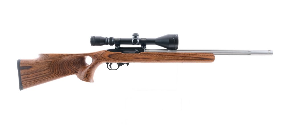 Description Description Ruger 10-22 in .22 Long Rifle with one, ten round removable rotary magazine with a 20″ Butler Creek fluted stainless barrel. Textured rubber butt pad. Laminated thumbhole stock with pistol grip. Volquartsen 10/22 trigger. Push button safety on trigger guard. Black finished receiver that is drilled and tapped for optics rail. Fitted with 1″ weaver rings with Simmons 3 – 9 x 50 scope with clear glass. Must ship to FFL holder. Condition: Good/Very Good with few scuffs from handling/use, some small spots of metal oxidation on barrel, and good rifled bore. Barrel Length: 20″ Serial: 252-92809 Manufacturer: RUGER Year: 2001 Caliber: .22 Long Rifle Model: 10/22