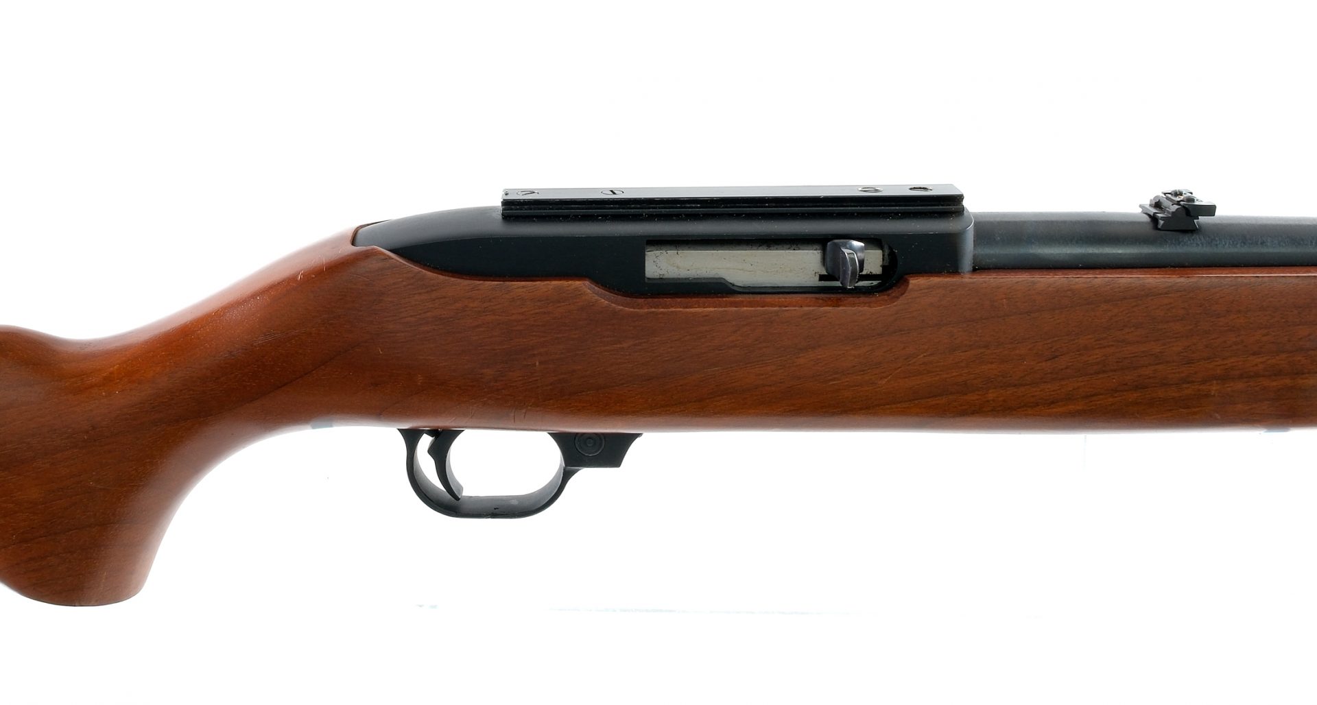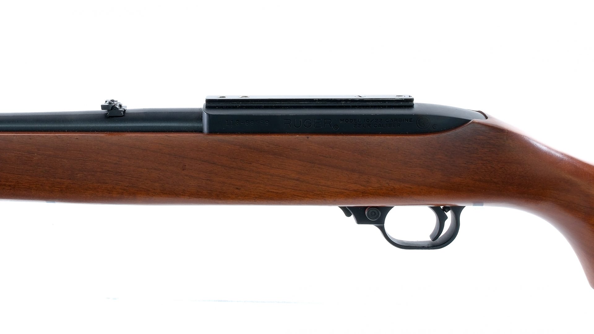 Description Ruger 10/22 chambered in .22 long rifle with one, ten round removable rotary magazine and 18.5″ barrel. Blued barrel, and charging handle. Anodized aluminum receiver. Cross bolt safety selector. Smooth wood stock. Adjustable rear flip up sight and fixed front blade. Must ship to FFL holder. Condition: Good/Very Good with some scratches and wear from handling and operation. Scratches, dings and edge wear in the wood. Scratches and scuffs on the butt plate. Clean rifled bore. Barrel Length: 18.5″ Serial: 113-69559 Manufacturer: RUGER Year: 1974 Caliber: .22 Long Rifle Model: 10/22 Book# 01655